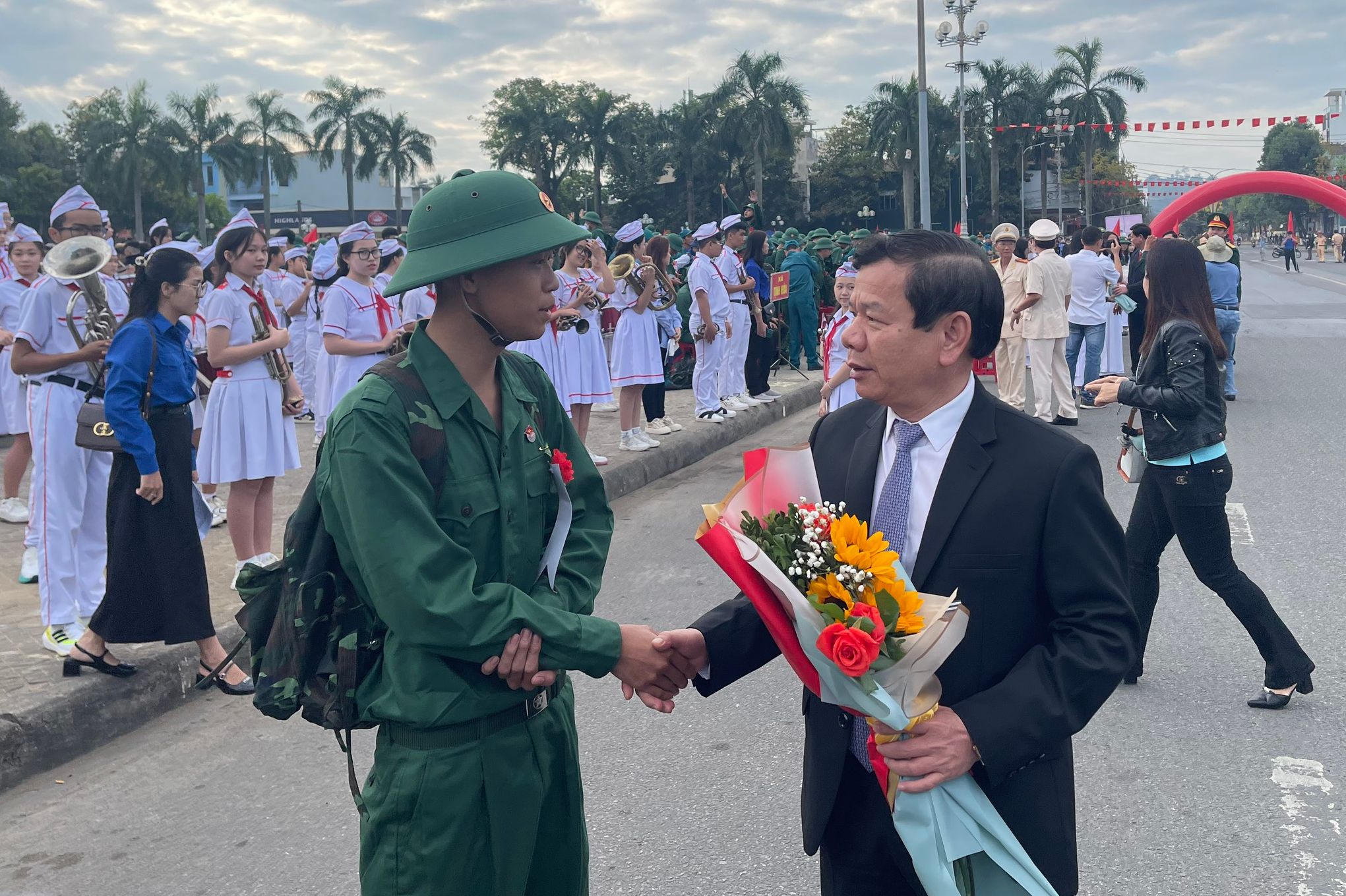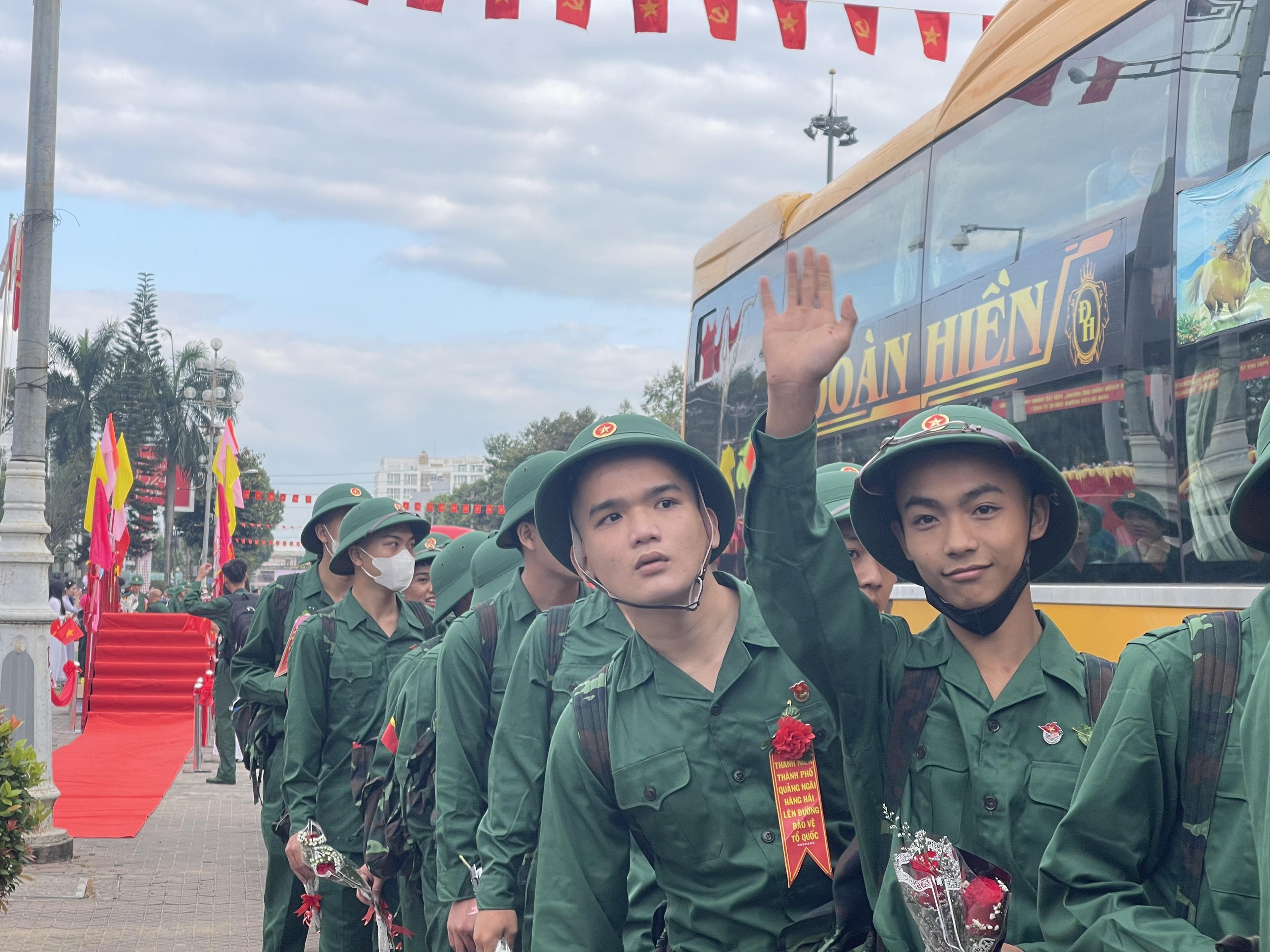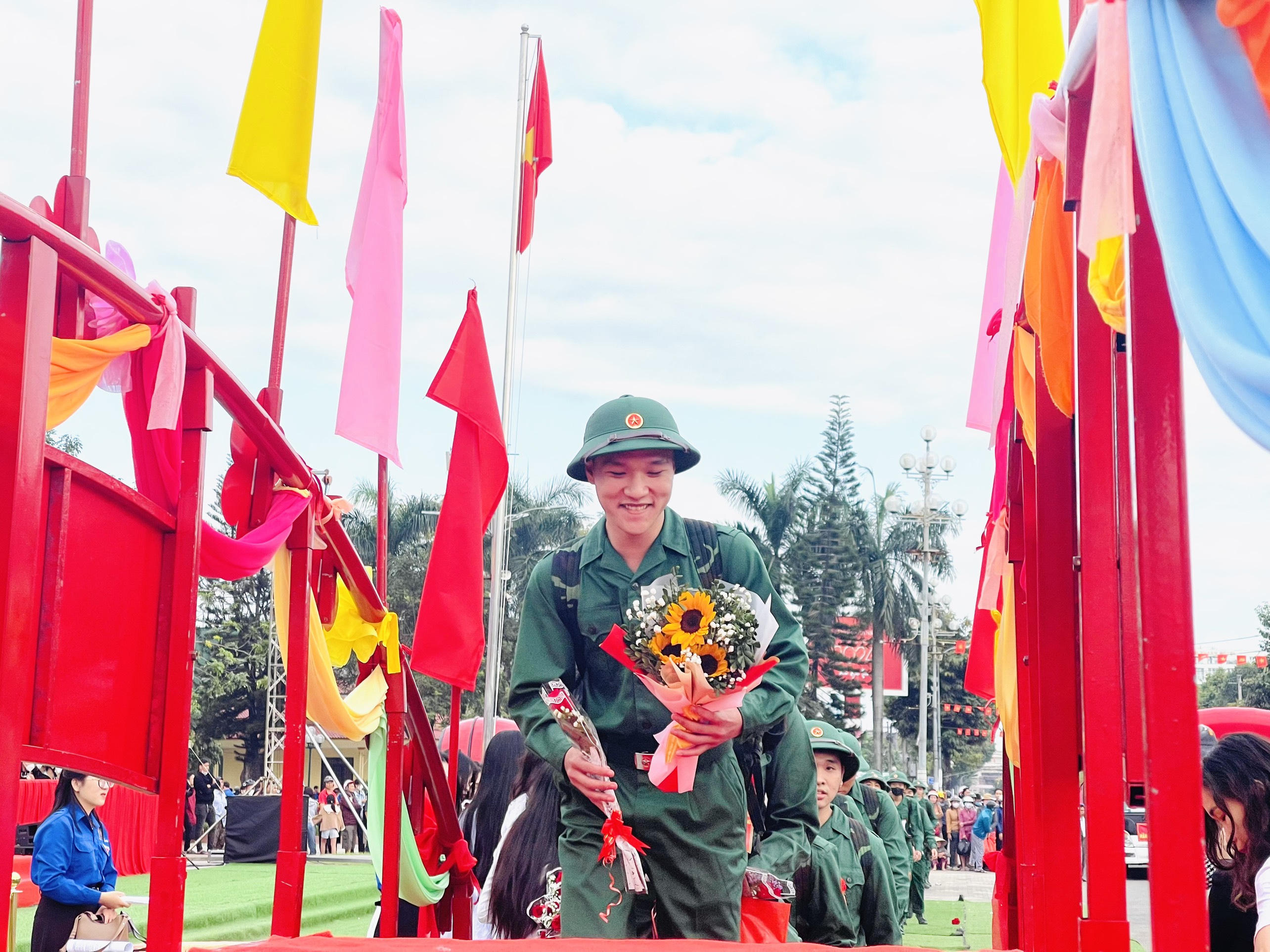 Các tân binh được tặng hoa, động viên trước giờ lên đường nhập ngũ. |