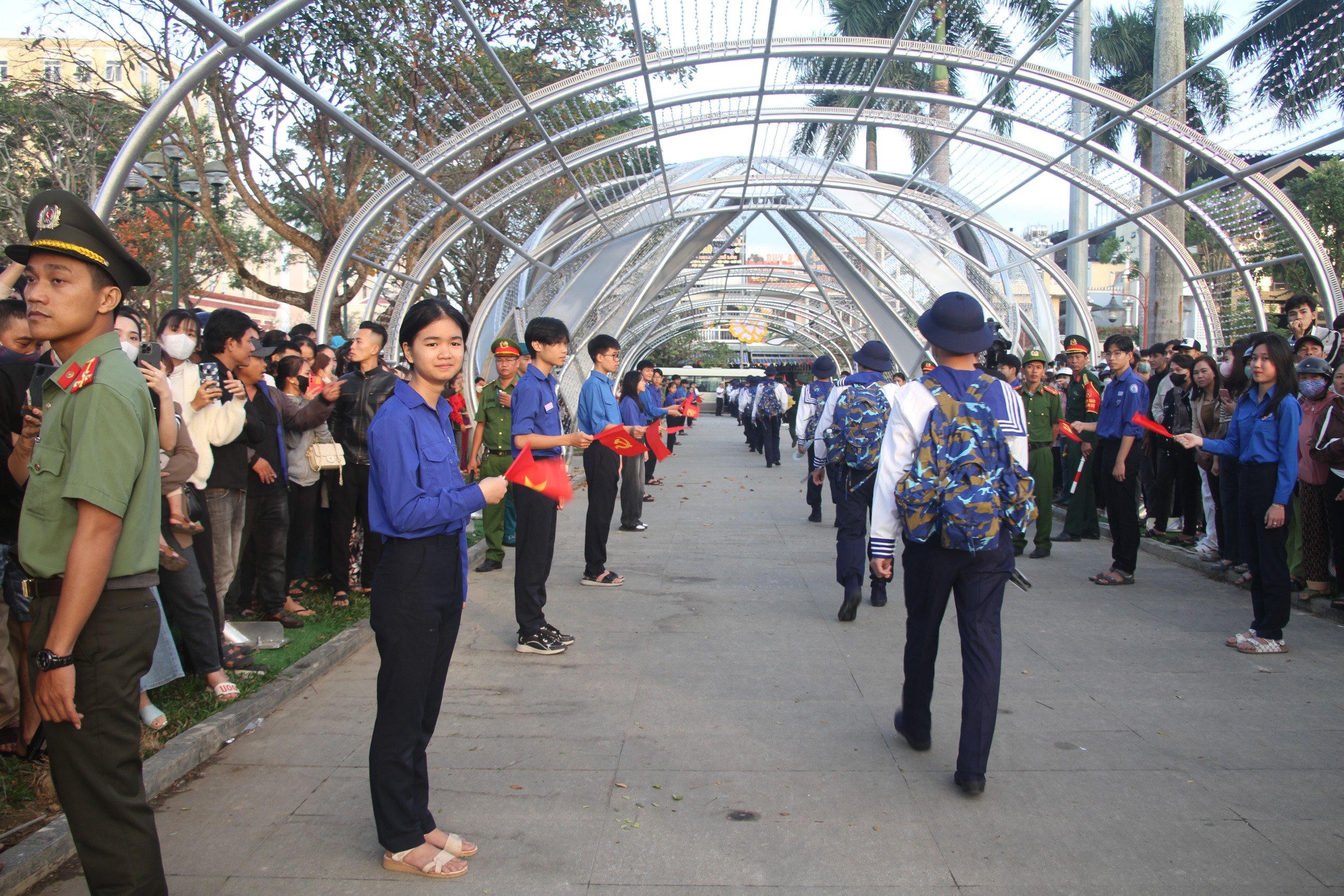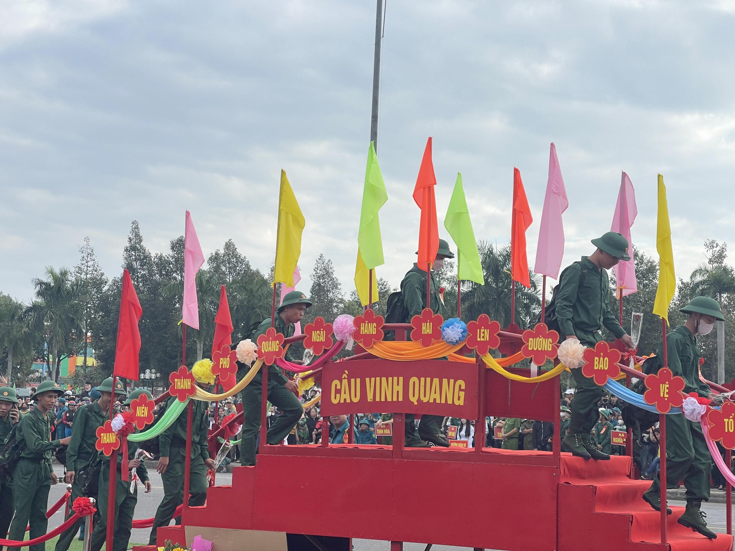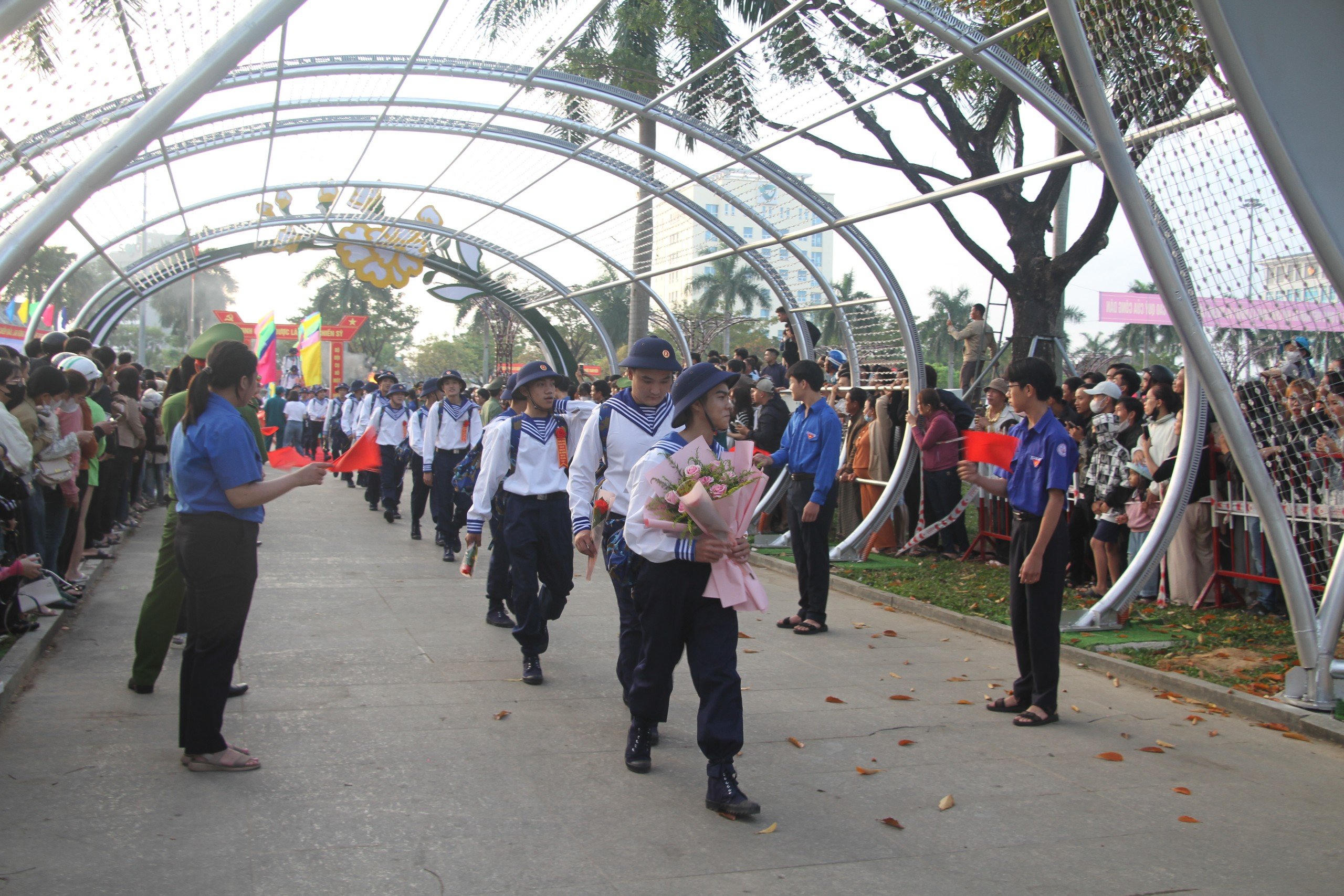Các tân binh của quân khu 5 hào hứng bước qua cầu vinh quang lên đường nhập ngũ. |