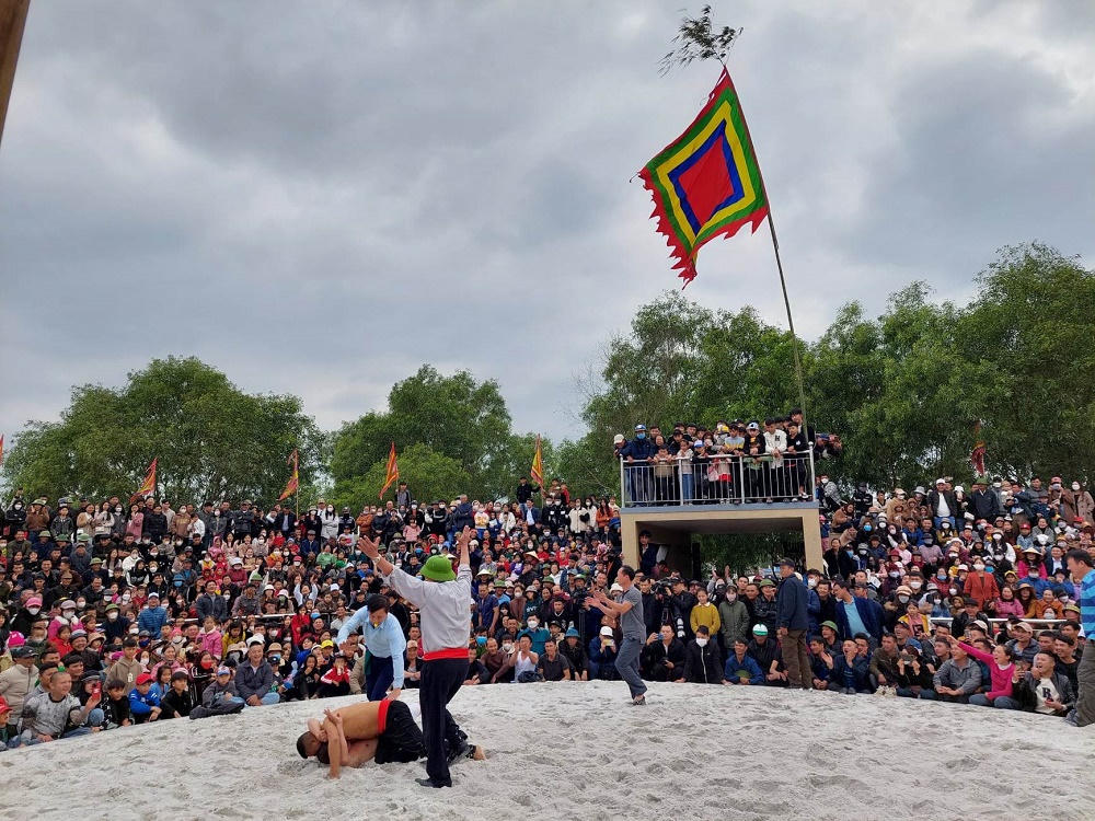 Hội vật rộn rã tiếng chiêng, tiếng trống thúc giục và tiếng reo hò cổ vũ của người xem. |