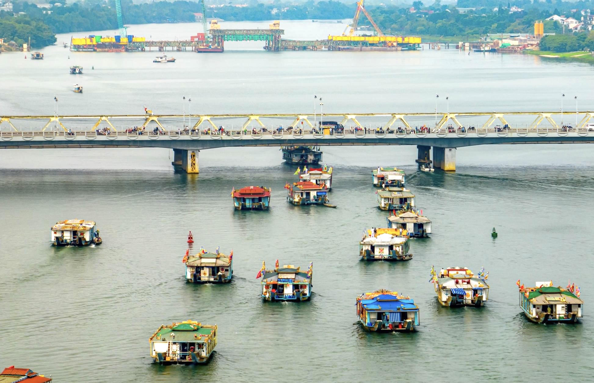 Các thuyền rồng tham gia trong đoàn rước Lễ hội, ngược dòng Hương lên điện Huệ Nam. |