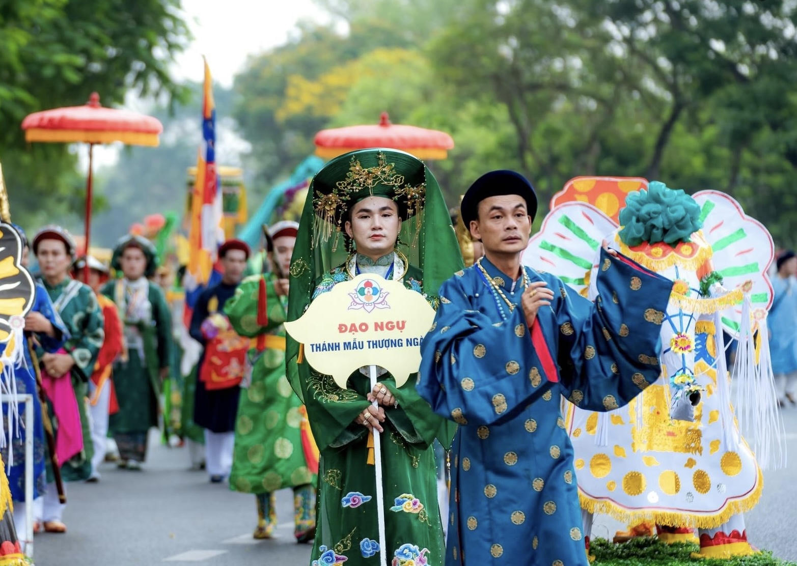 Đoàn rước hàng trăm người tái hiện nét văn hóa truyền thống tín ngưỡng độc đáo, phô diễn đa dạng trang phục cổ xưa đầy sắc màu kết hợp với các hình thức diễn xướng, vũ điệu đặc trưng của tín ngưỡng thờ Mẫu.