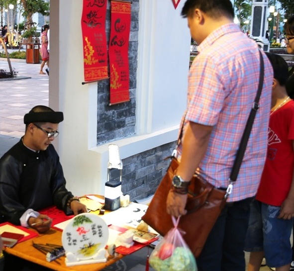 Khách đến du xuân ở Asia Park còn tranh thủ xin chữ đầu năm. Đây vốn là nét đẹp văn hóa không thể thiếu trong dịp cổ truyền của người Việt.