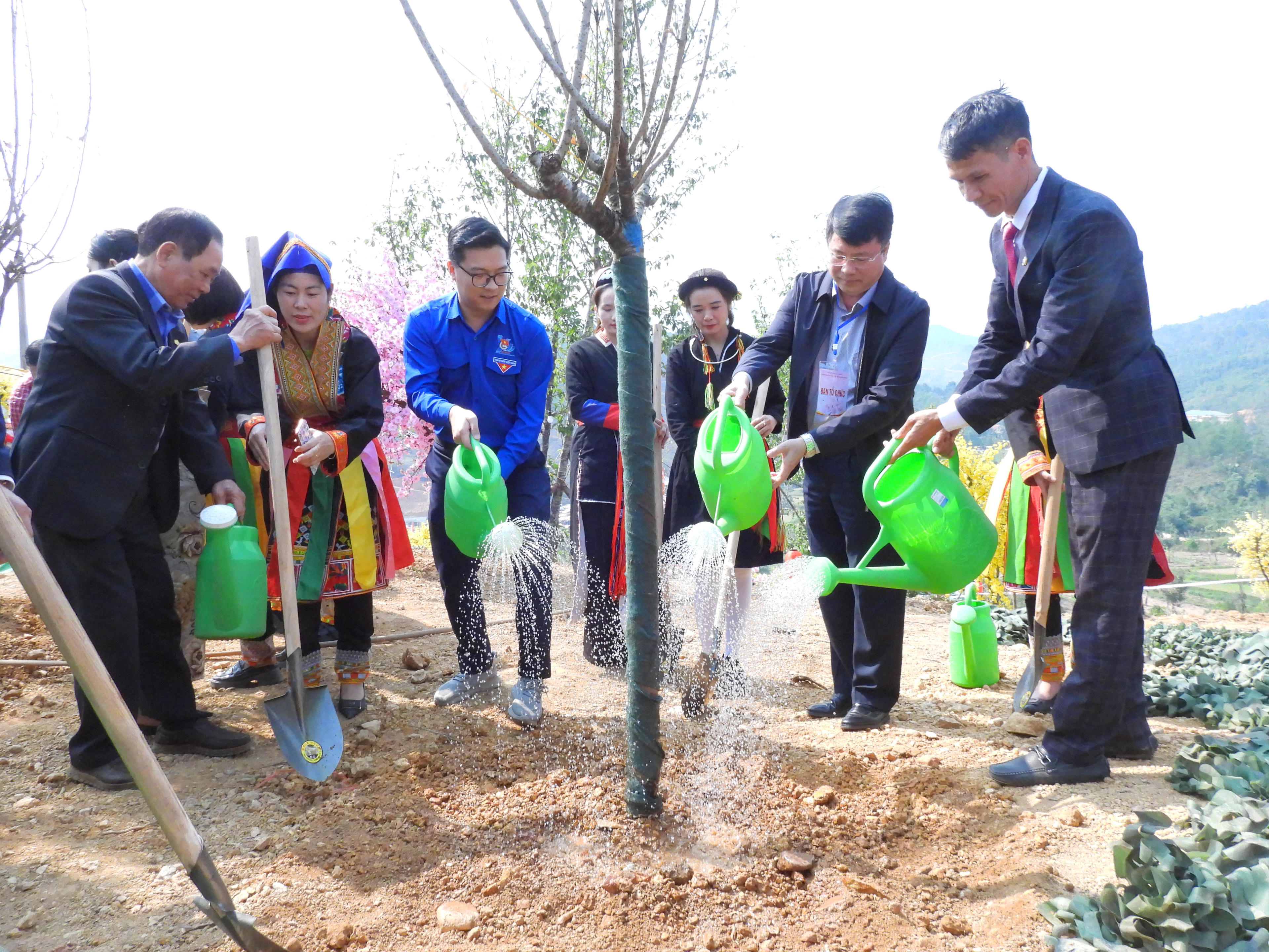 | Các đại biểu tham gia trồng cây hoa Anh đào tại Lễ hội Hoa Anh đào - Kỳ Thượng năm 2025. |