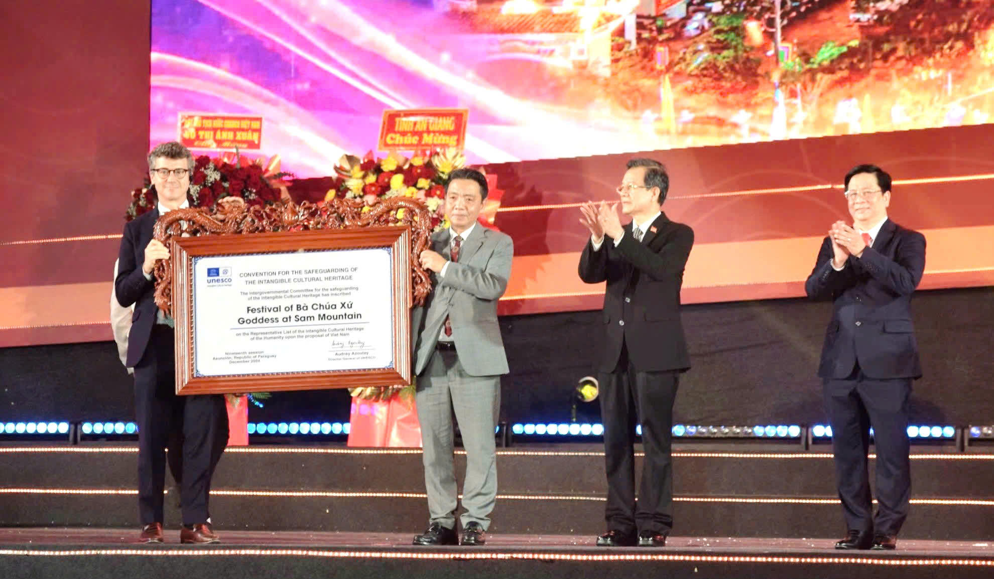 Lãnh đạo tỉnh An Giang đón nhận bằng UNESCO ghi danh Lễ hội Vía Bà Chúa Xứ núi Sam vào danh sách Di sản Văn hóa phi vật thể đại diện của nhân loại. (Ảnh: Khánh Thùy) |