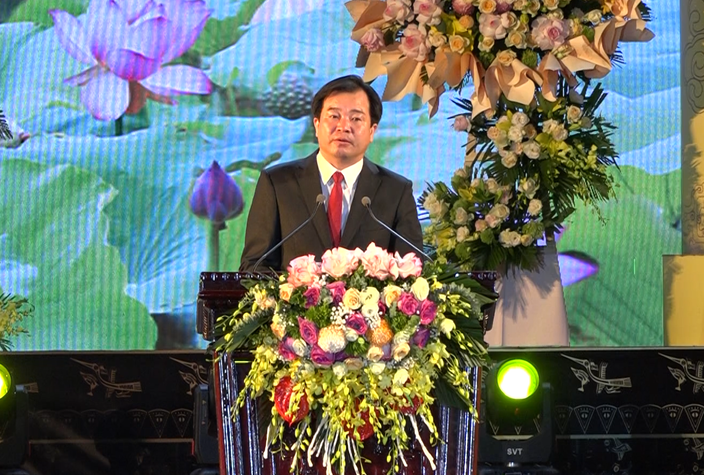 Bí thư Huyện ủy Nho Quan Đặng Xuân Nguyên trình bày diễn văn kỷ niệm. |