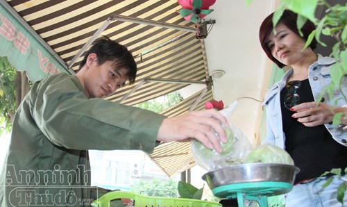 Lệ Rơi cho biết anh lên Hà Nội từ hôm 17/10, mang theo 300 kg ổi để bán. "Đây là số ổi vườn nhà tôi trồng được và thu gom thêm từ vườn của một số người hàng xóm. Tôi bán trong ngày 17 và sáng 19/10 đã gần hết 300kg rồi", Lệ Rơi chỉ vào thùng ổi khoảng 30kg còn sót lại, tươi cười nói.