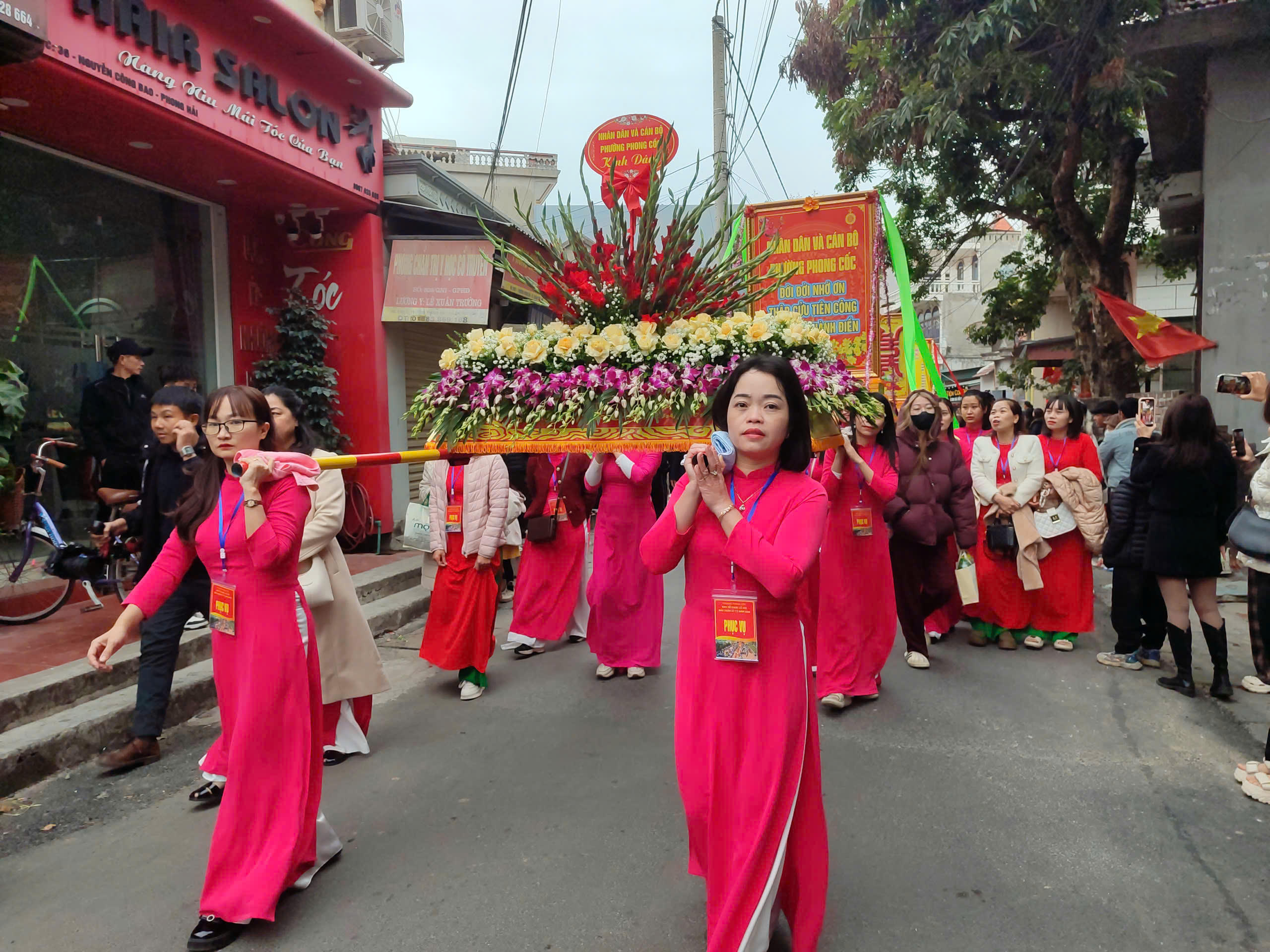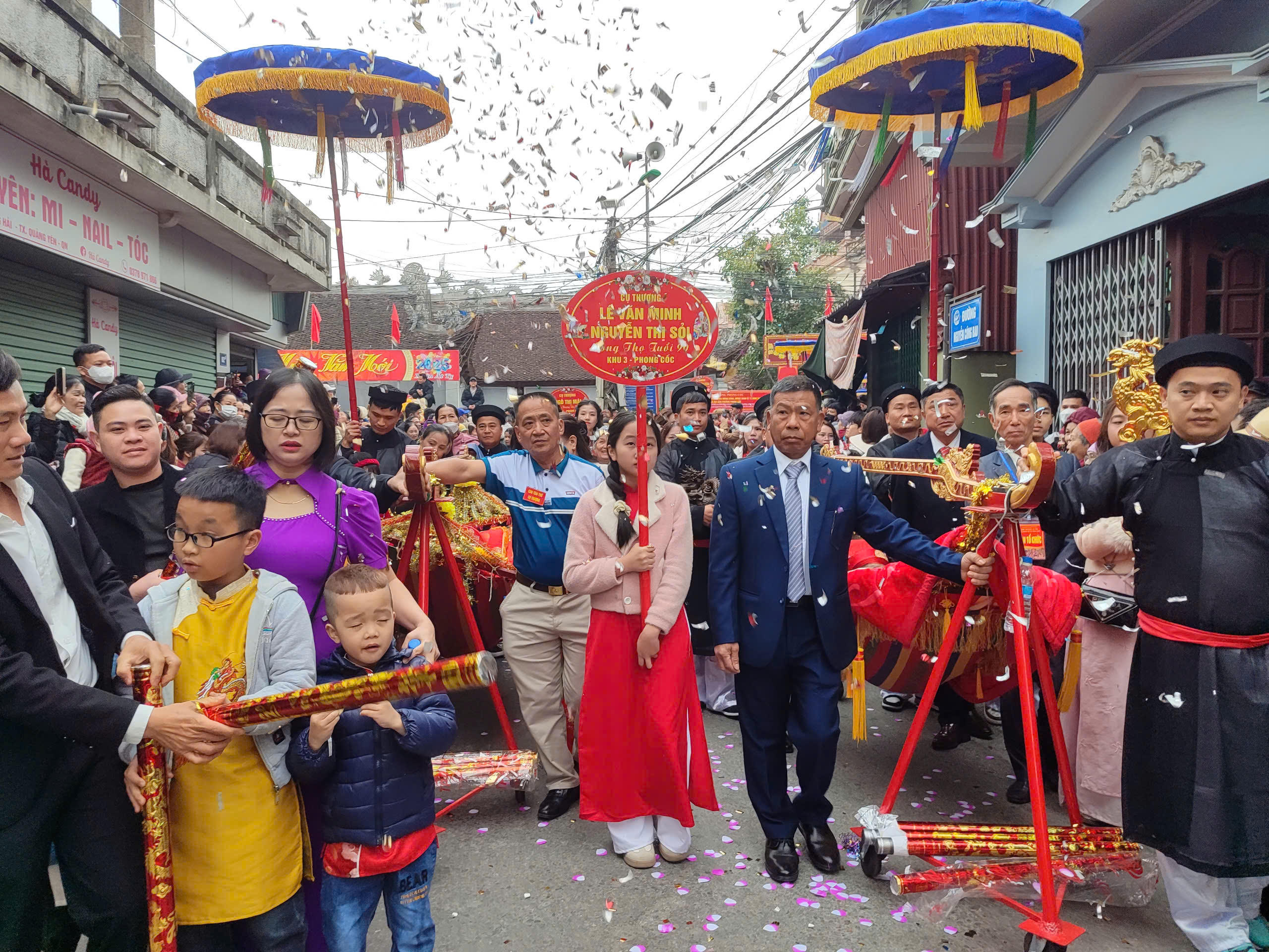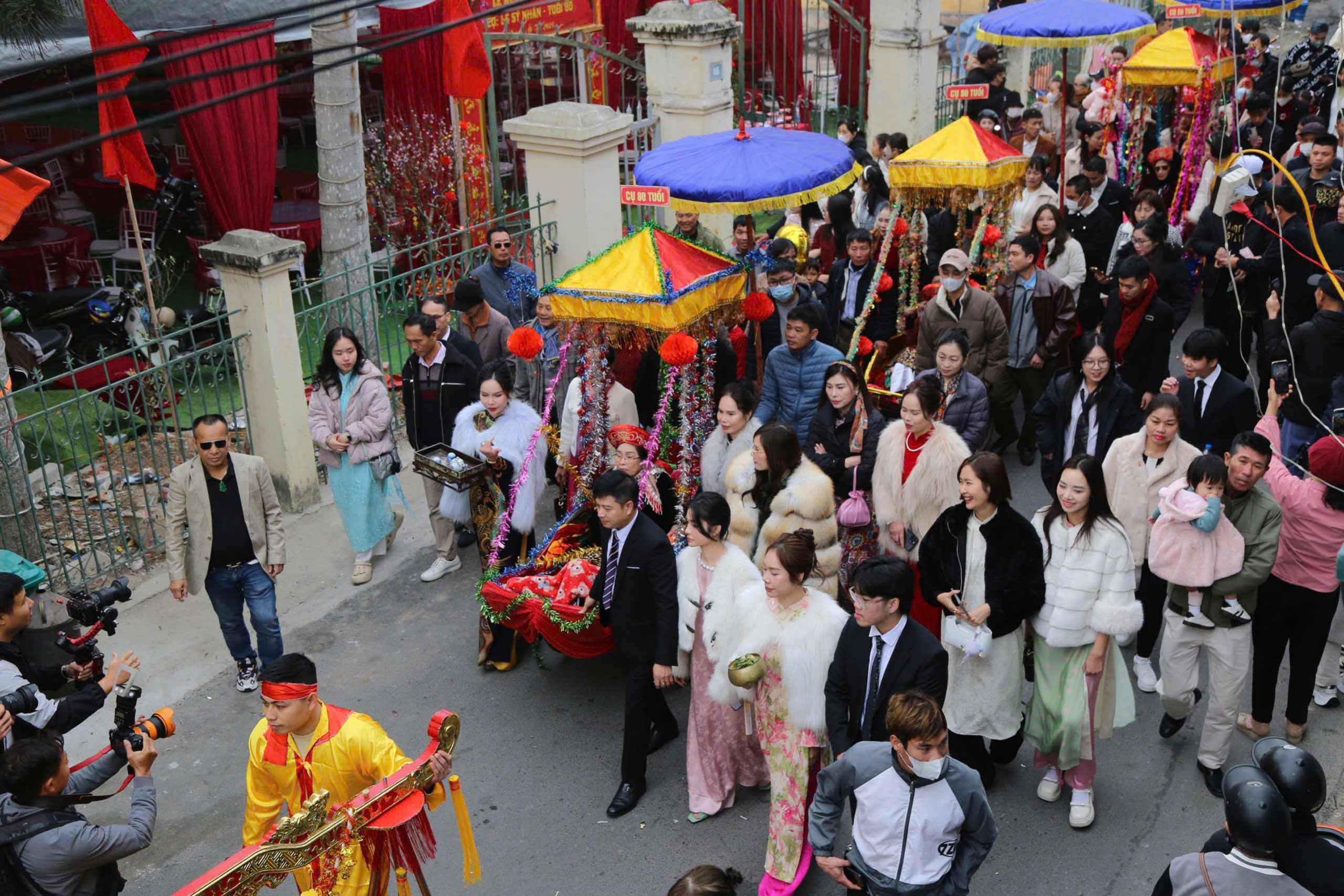 | Đoàn rước trang trọng đưa các cụ đến Miếu Tiên Công, thể hiện sự tôn kính và cầu mong sự trường thọ, hạnh phúc. |