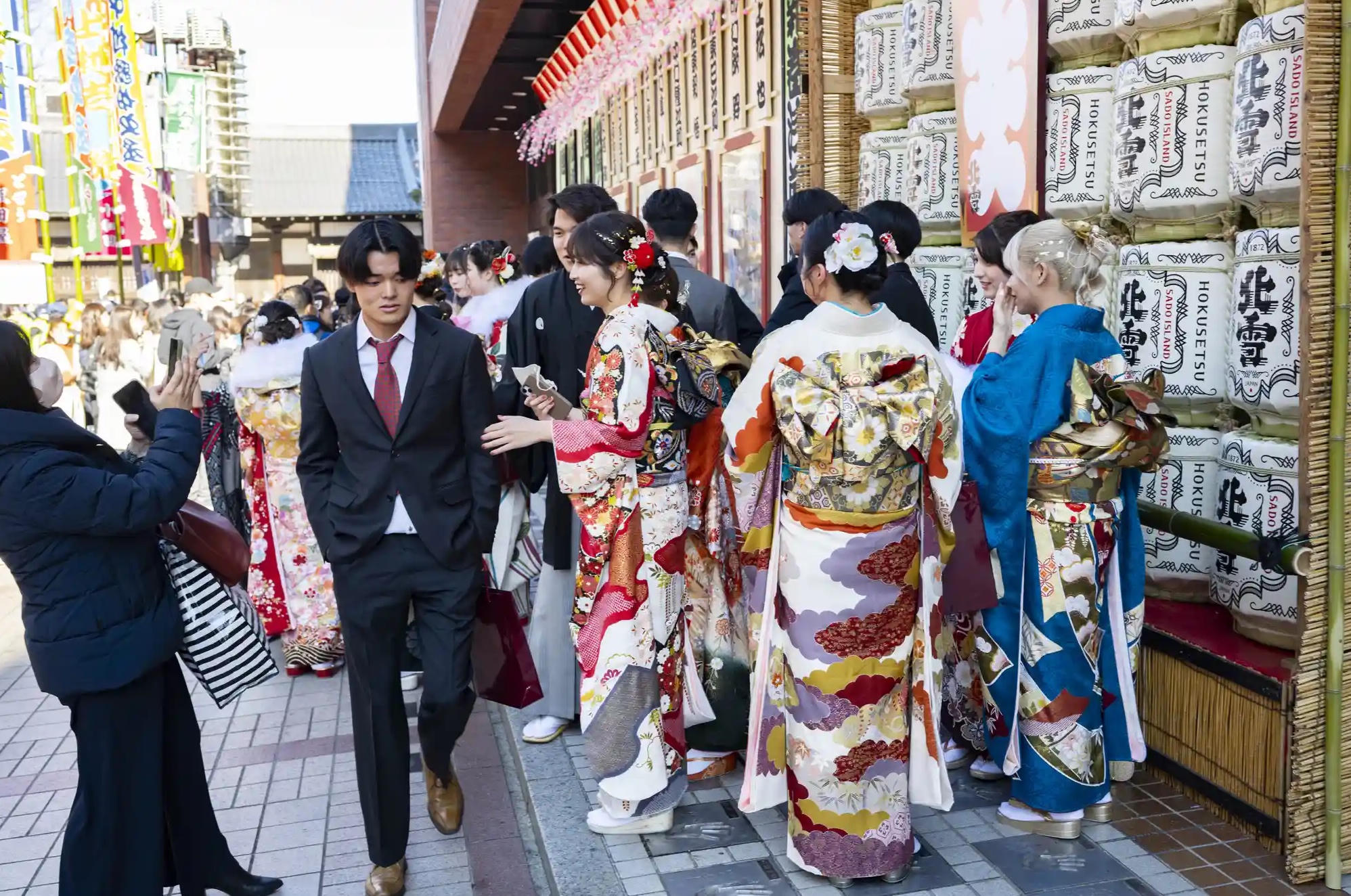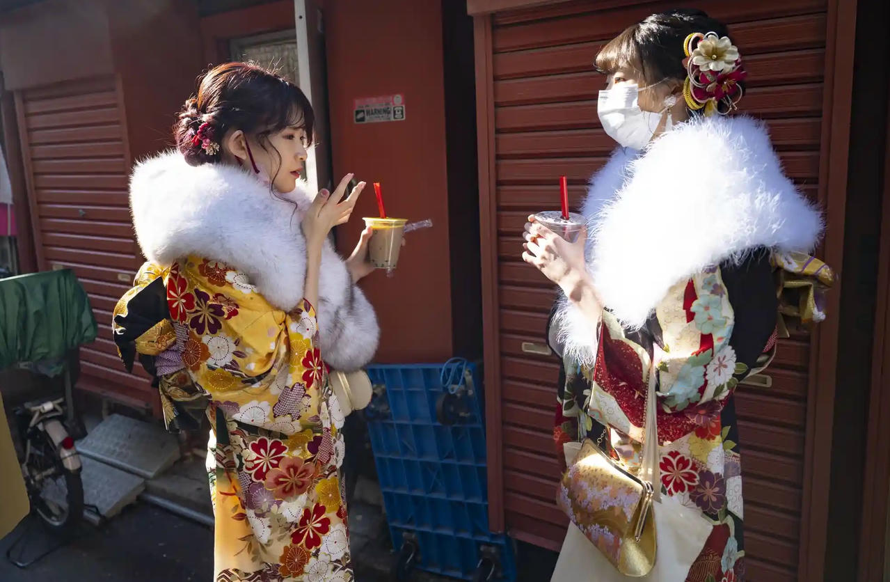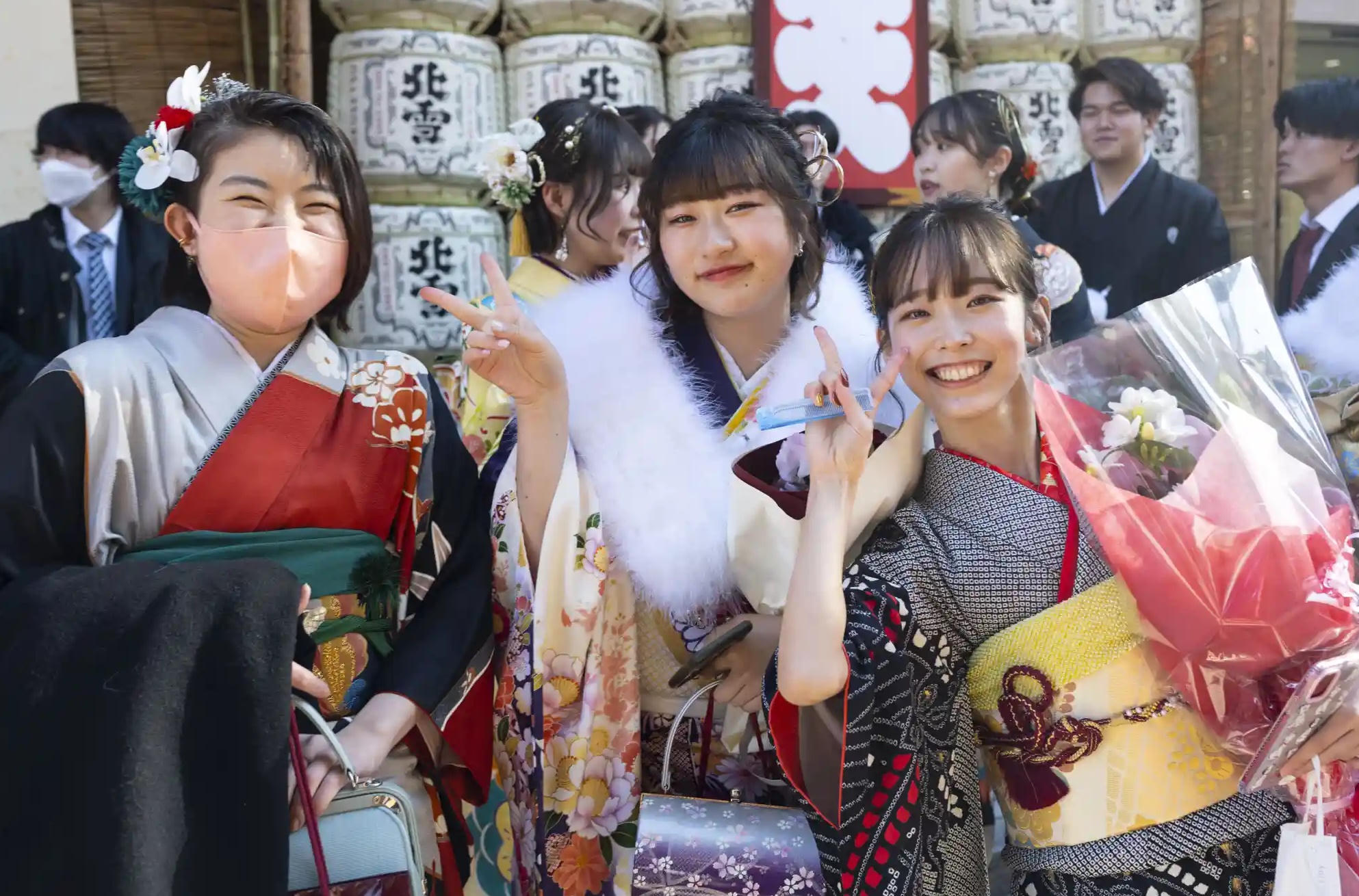 Các cô gái mặc trang phục truyền thống của Nhật Bản kỷ niệm Ngày Trưởng thành tại Chùa Phật giáo Sensoji ở Tokyo.