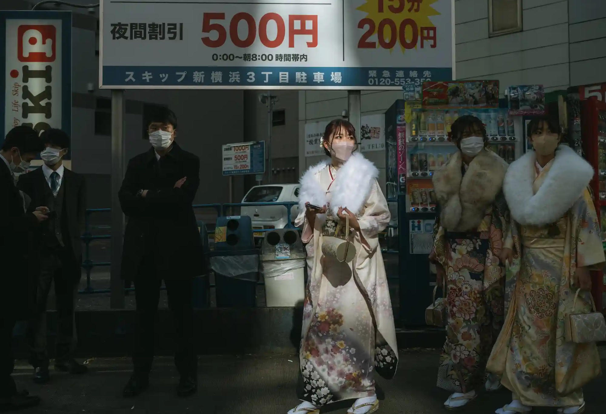 Những thiếu nữ mặc kimono và đeo khẩu trang ở Yokohama, thành phố lớn thứ 2 Nhật Bản.