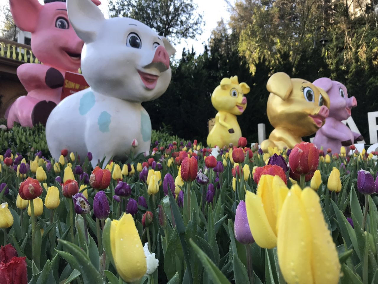 Lãng mạn là thế, nhưng tulip chưa phải là tất cả những gì thú vị nhất của Bà Nà khiến du khách muốn “thời gian ngừng lại”. Lẫn trong hàng ngàn bông tulip rực rỡ và quyến rũ ấy, là những chú heo ngộ nghĩnh, xinh xắn với đủ sắc màu và tạo hình.