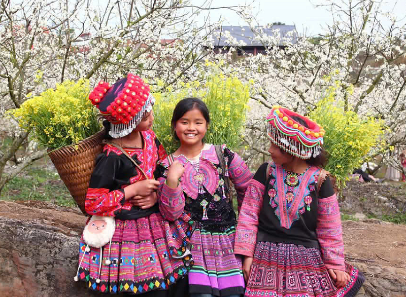 Những thiếu nữ dân tộc Mông xúng xính váy áo chuyện trò bên những vườn mận. (Ảnh: CTV) |