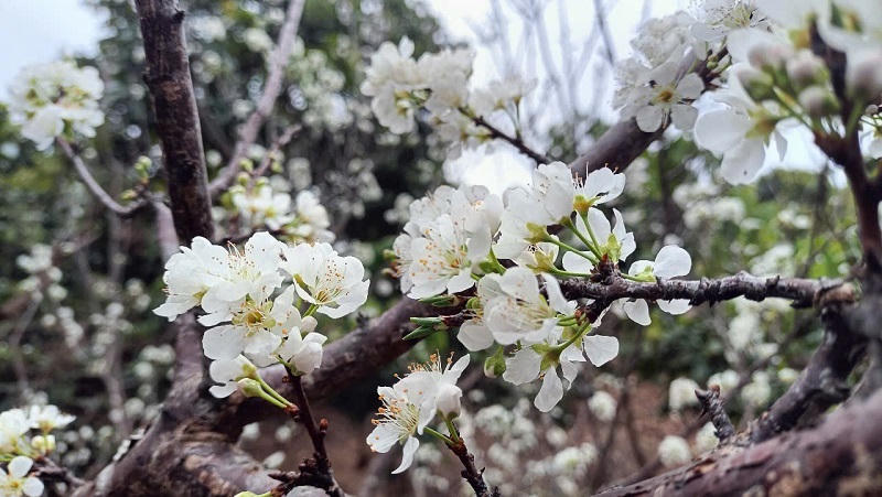 Những cây mận hoa nở trắng xóa giống như bông tuyết bên các thung lũng, chân đồi. (Ảnh: CTV) |