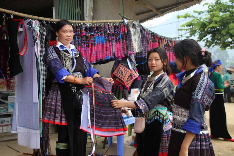 Các thiếu nữ dân tộc Mông xúng xính trong bộ váy áo truyền thống tại ngày hội. |