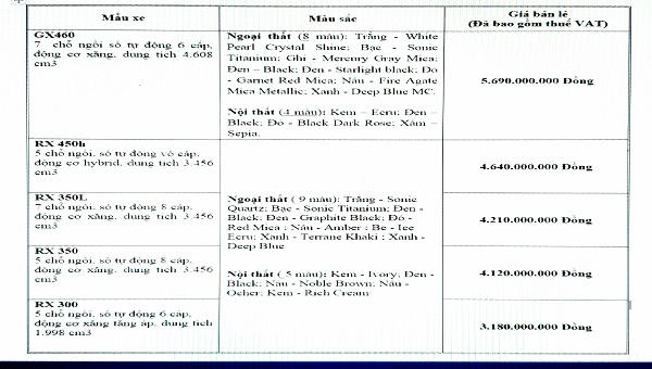 Tại Việt Nam, Lexus với các phiên bản RX450h, RX 350L, RX 350, RX 300 và GX 460 mới có giá chi tiết như sau: