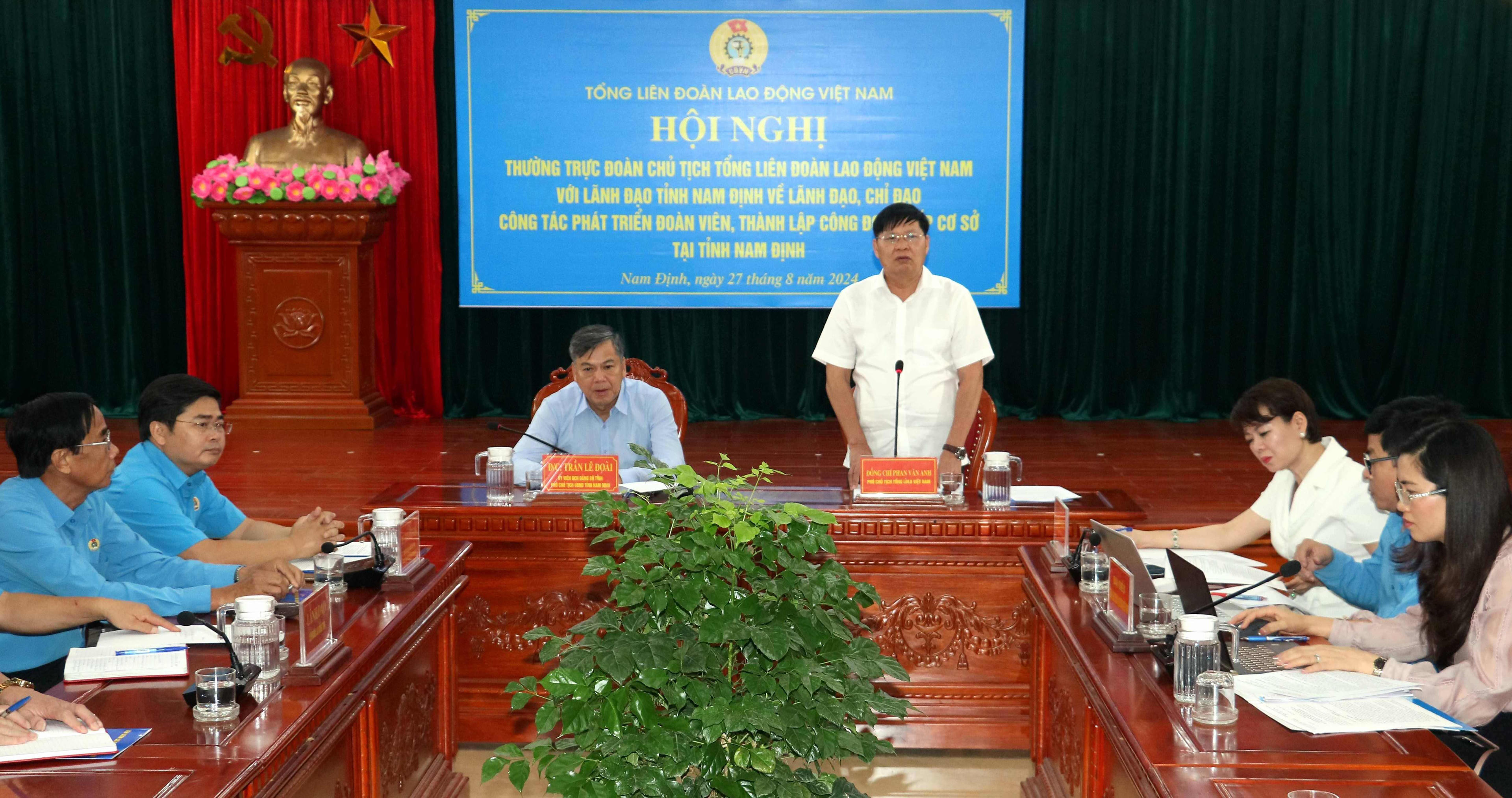 Phát biểu tại hội nghị, ông Phan Văn Anh - Phó Chủ tịch Tổng LĐLĐ Việt Nam nhấn mạnh: "Các cấp Công đoàn tỉnh Nam Định cần tiếp tục tập trung mọi nguồn lực, có giải pháp cụ thể để đẩy mạnh phát triển đoàn viên, thành lập CĐCS. Đồng thời phối hợp với các sở, ban, ngành của tỉnh nắm chắc số liệu doanh nghiệp, số lao động trên địa bàn để có thông tin cụ thể.