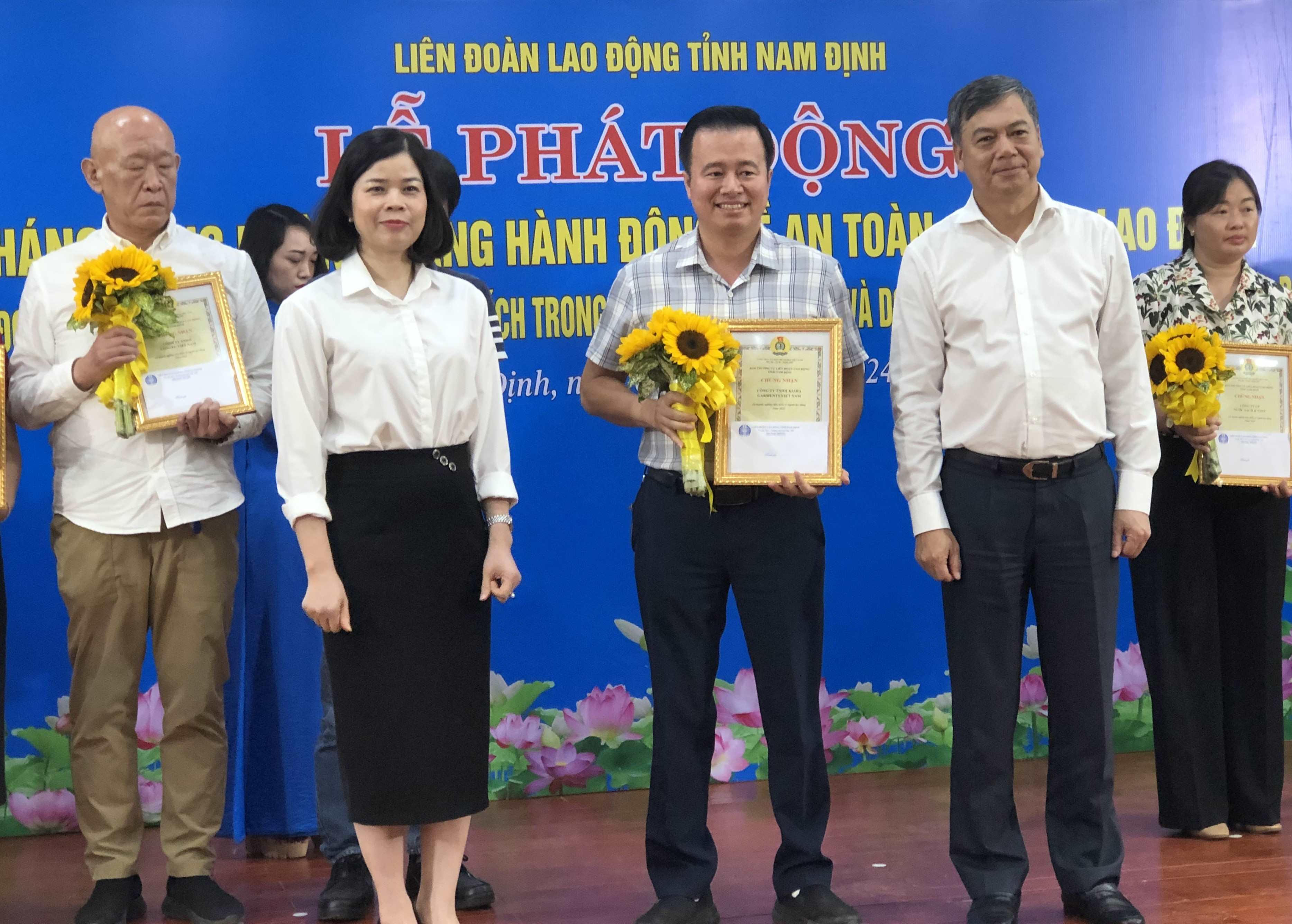 Cũng tại buổi Lễ, Ban Thường vụ Liên đoàn Lao động tỉnh Nam Định trao bằng khen, giấy chứng nhận cho các tập thể, cá nhân tiêu biểu, có nhiều đóng góp trong lao động sản xuất và tích cực tham gia các hoạt động do tổ chức Công đoàn phát động.