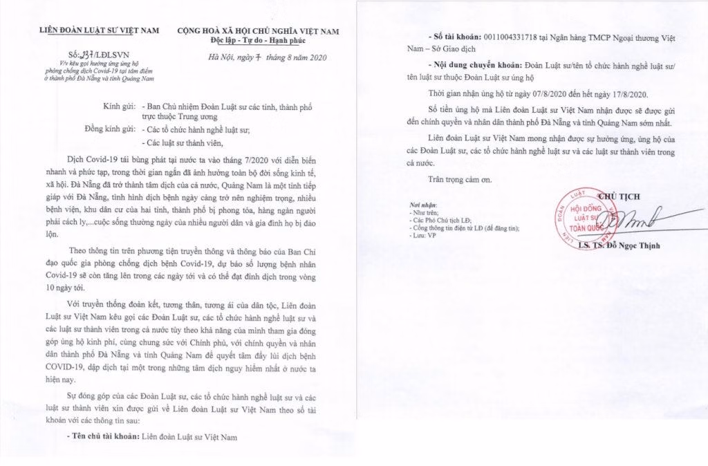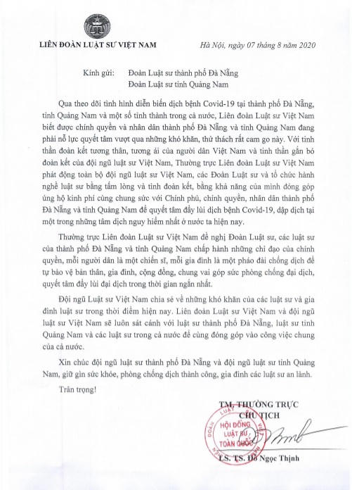Với truyền thống đoàn kết, tương thân, tương ái của dân tộc, Liên đoàn Luật sư Việt Nam kêu gọi Ban Chủ nhiệm các Đoàn Luật sư, các tổ chức hành nghề luật sư và các Luật sư thành viên trong cả nước tùy theo khả năng của mình tham gia đóng góp ủng hộ kinh phí, cùng chung sức với Chính phủ, chính quyền và nhân dân TP. Đà Nẵng và tỉnh Quảng Nam để quyết tâm đẩy lùi dịch bệnh Covid-19.