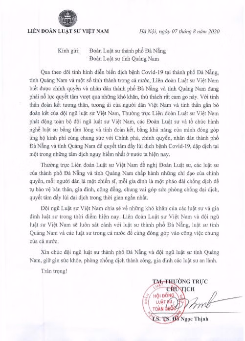 Sau khi nhận được thư của Luật sư Võ Văn Đáng, Thường trực Liên đoàn Luật sư Việt Nam đã thống nhất ban hành Văn bản số 237/LĐLSVN, ngày 07/8/2020 về việc kêu gọi và ủng hộ phòng chống dịch Covid-19 tại tâm điểm ở TP. Đà Nẵng và tỉnh Quảng Nam. Và Thường trực Liên đoàn Luật sư Việt Nam có văn bản chia sẻ với Đoàn Luật sư TP. Đà Nẵng và Đoàn Luật sư tỉnh Quảng Nam.