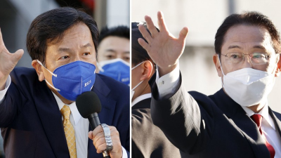 Ông Yukio Edano Chủ tịch CDPJ và Thủ tướng Fumio Kishida của LDP trong ngày vận động cuối cùng 30/10/2021. Ảnh: Kyodo News |