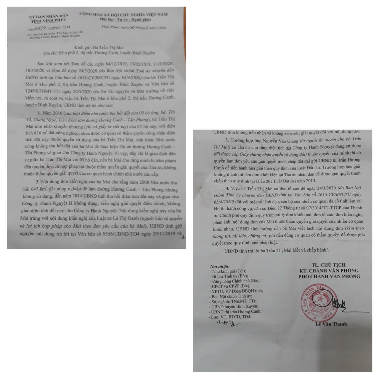 Mới đây nhất, ngày 19/1/2021, UBND tỉnh Vĩnh Phúc có văn bản số 375/UBND-TD4 do Phó Chánh văn phòng Lê Văn Thanh ký thay Chánh văn phòng, thừa lệnh chủ tịch, trong đó nêu: Sau khi xem xét đơn đề ngày 3/1/2021 của bà Trần Thị Mai ở khu phố 2, thị trấn Hương Canh, huyện Bình Xuyên có nội dung: Tố cáo Chủ tịch UBND tỉnh thu hồi đất và giao đất cho Công ty Cổ phần thương mại và dịch vụ Hanh Nguyệt tại thị trấn Hương Canh, huyện Bình Xuyên không đúng quy định của pháp luật…; Chủ tịch UBND tỉnh có ý kiến như sau: