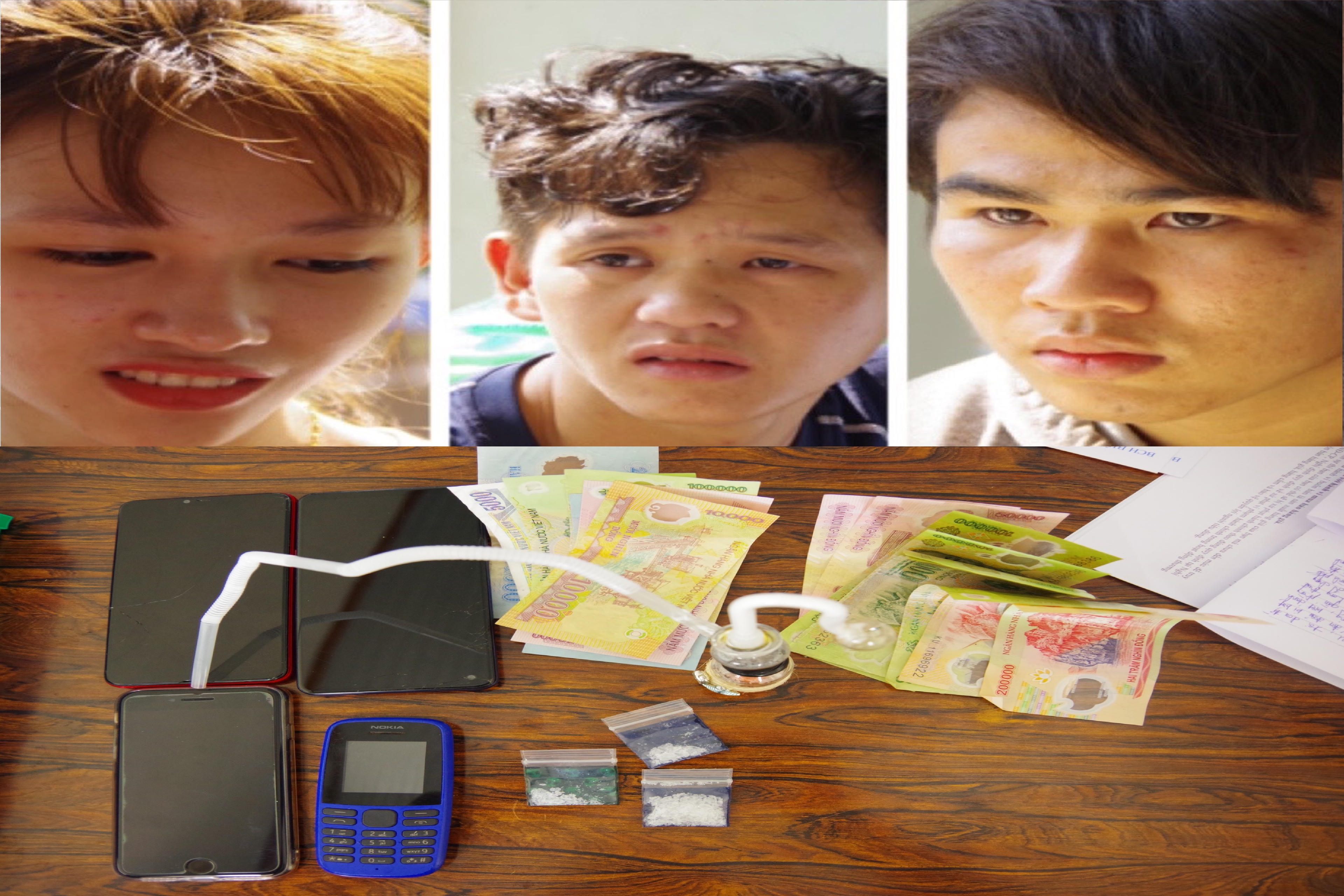 Lực lượng chức năng thu giữ 03 gói ma túy tổng hợp dạng đá có trọng lượng khoảng 4gram, 1.285.000 đồng (một triệu hai trăm tám mươi lăm nghìn đồng), 02 xe máy và 03 điện thoại di động.