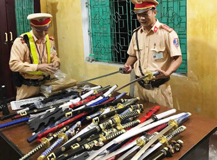 Trên xe tổ công tác phát hiện 1 khẩu súng hơi săn bắn đạn bi do nước ngoài sản xuất, 1 bình xịt hơi cay do nước ngoài sản xuất, 1 thanh kiếm dài 80cm, 1 thanh đao dài 1,5m không có giấy tờ chứng minh nguồn gốc.