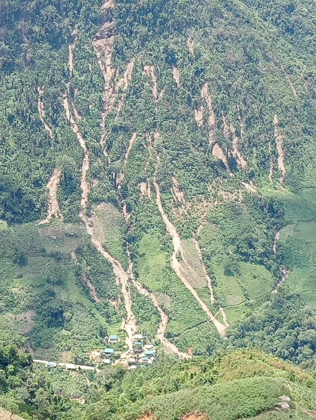 Địa hình xã Nhôn Mai (nhìn từ trên cao) đồi núi khiến lũ quét xảy ra rất nguy hiểm và tiềm ẩn nhiều mối nguy |