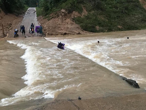 Hiện mực nước tại cầu tràn vẫn còn ngập sâu gần 2m. Muốn đi ra bên ngoài, người dân trong bản phải dùng ghe để sang, hay nhờ các thanh niên, trai tráng cõng qua.