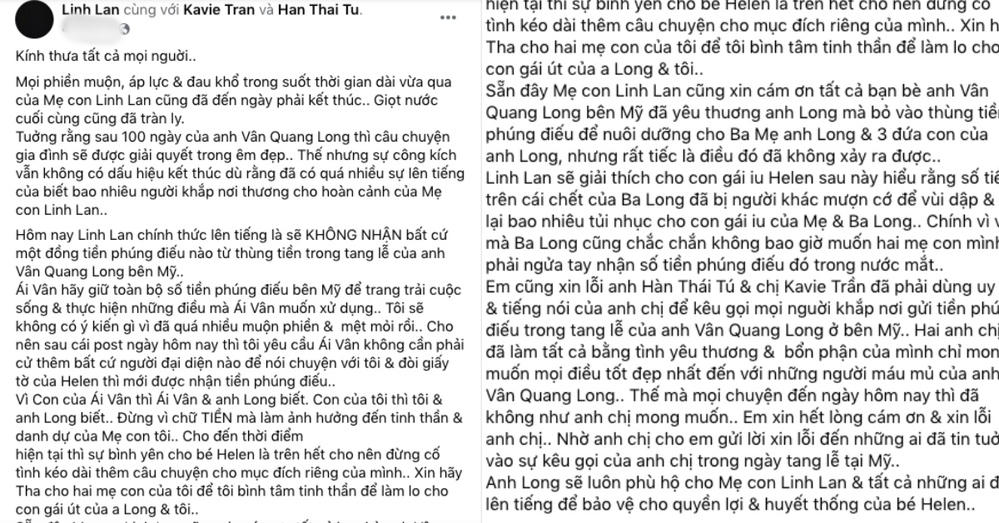 Linh Lan viết: "Hôm nay Linh Lan chính thức lên tiếng là sẽ không nhận bất cứ một đồng tiền phúng điếu nào từ thùng tiền trong tang lễ của anh Vân Quang Long bên Mỹ. Ái Vân hãy giữ toàn bộ số tiền phúng điếu bên Mỹ để trang trải cuộc sống và thực hiện những điều mà Ái Vân muốn sử dụng. Tôi sẽ không có ý kiến gì vì đã quá nhiều muộn phiền, mệt mỏi rồi. Cho nên sau cái post ngày hôm nay thì tôi yêu cầu Ái Vân không cần phải cử thêm bất cứ người đại diện nào để nói chuyện với tôi và đòi giấy tờ của Helen thì mới được nhận tiền phúng điếu".