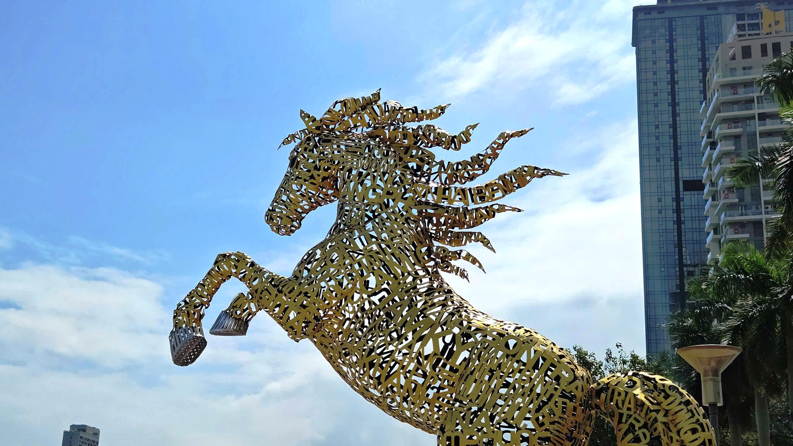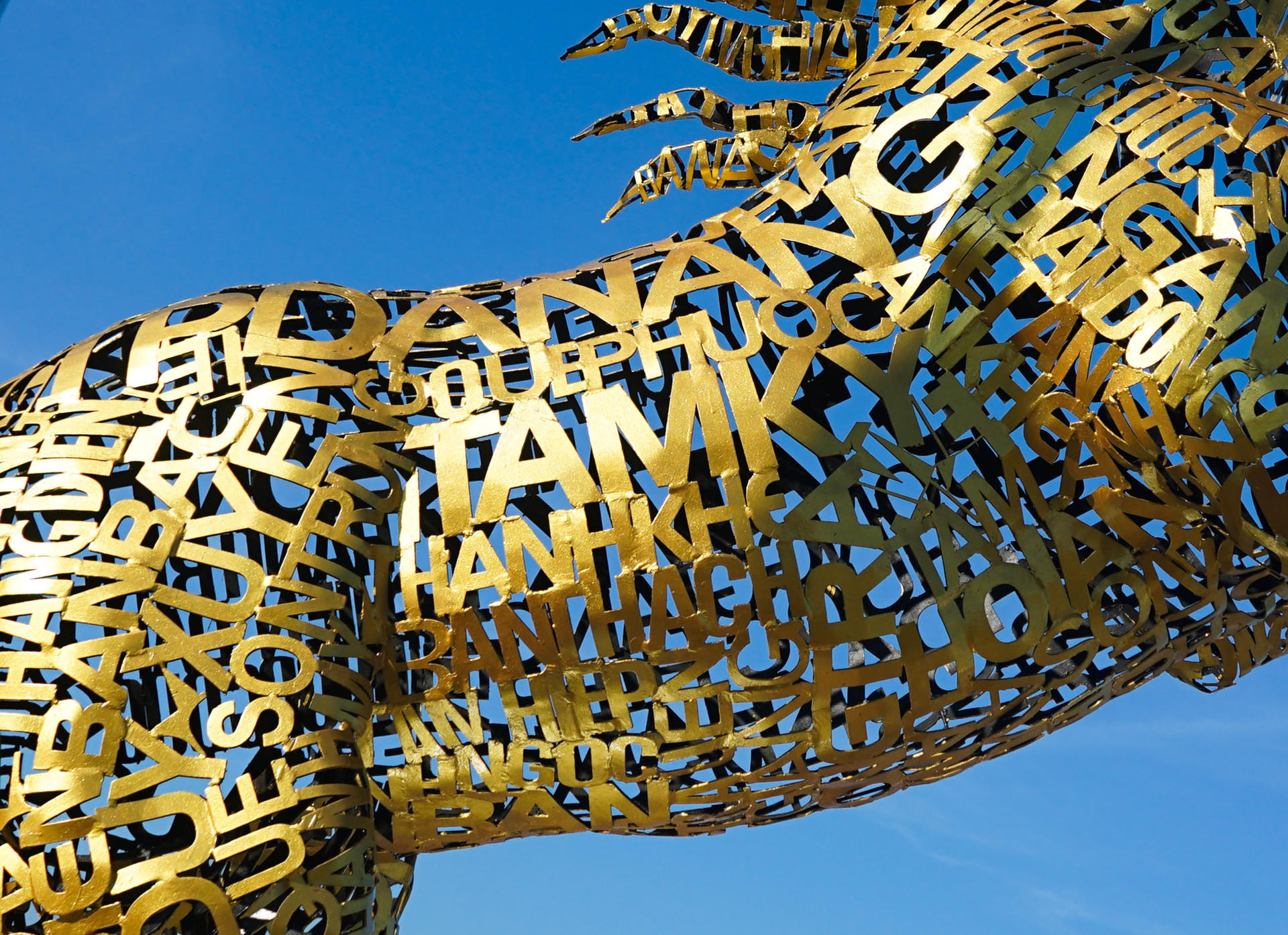 Tác phẩm mang tên “Kim Mã Hợp Nhất”, nổi bật với toàn bộ thân ngựa được ghép từ các mảnh sắt khắc tên 94 đơn vị hành chính cấp xã sau sắp xếp của thành phố, gồm 23 phường, 70 xã và đặc khu Hoàng Sa.