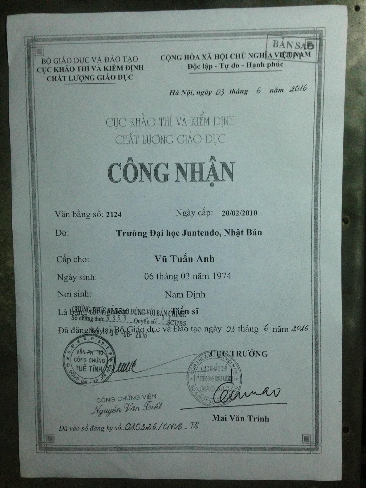 Thực tế, trước ngày 1/4/2016 (thời điểm bác sỹ Nguyễn Thanh Tân, nguyên giám đốc bệnh viện về hưu), ông Vũ Tuấn Anh khai trong hồ sơ lý lịch là tiến sỹ để ứng cử chức danh giám đốc bệnh viện và đảm nhiệm chức vụ phó giám đốc phụ trách. Việc này không đúng quy định pháp luật bởi theo quyết định số 77/2007/BGDĐT ngày 20/12/2007 của Bộ trưởng Bộ Giáo dục và Đào tạo quy định, các cá nhân được đào tạo tại nước ngoài phải đến Cục Khảo thí và Kiểm định chất lượng giáo dục công nhận văn bằng để thực hiện các quyền lợi và nghĩa vụ theo quy định.