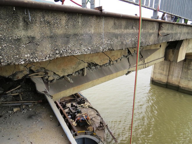 Cabin mắc kẹt dưới gầm, chìa phần đầu và đuôi ra hai bên cầu. Đêm qua, phương án cứu hộ được đưa ra là khoan đỉnh cầu để xử lý điểm mắc kẹt giữa tàu và dầm, sau đó bơm nước cho tàu chìm để dễ dàng đưa ra ngoài.