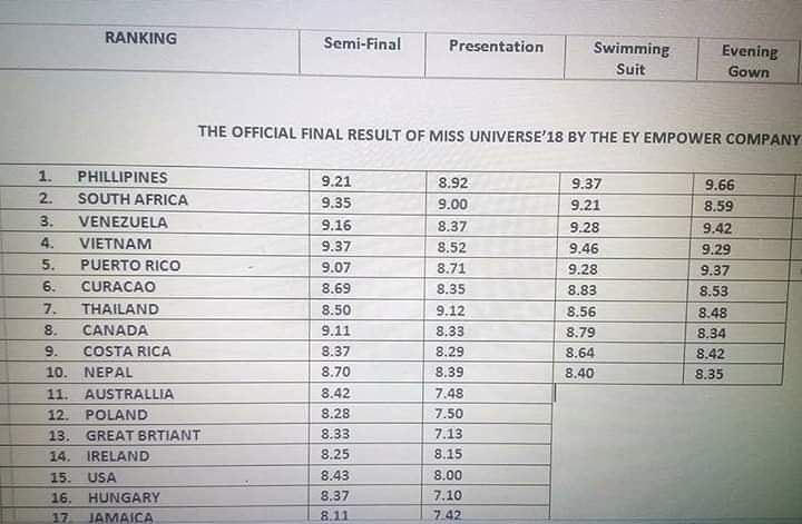 Tuy nhiên, bảng điểm trên chỉ là hình ảnh lan truyền qua mạng và hiện vẫn chưa có nguồn chứng thực. Bởi thông thường, các cuộc thi sắc đẹp không bao giờ để lộ bảng điểm chung cuộc.