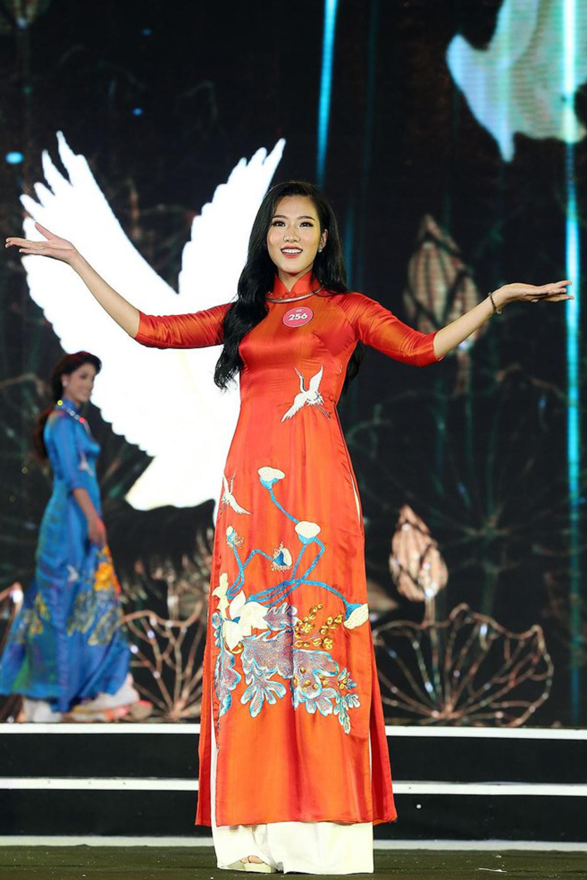 Trong trang phục áo dài truyền thống, các thí sinh tự tin sải bước với phần thi đầu tiên. 38 bộ áo dài với 38 họa tiết nhằm lưu giữ và giới thiệu văn hóa truyền thống dân gian.