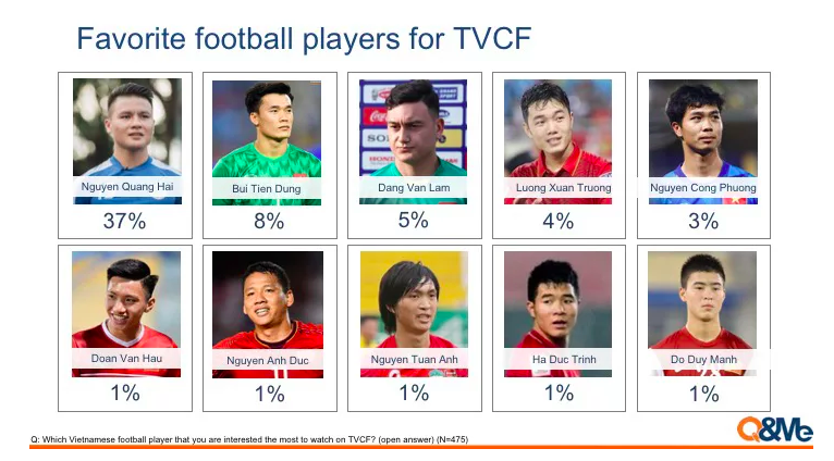 Kết quả, người nổi tiếng đầu tiên là chàng trai "áp phích bóng đá" Nguyễn Quang Hải - gương mặt cầu thủ chiếm lĩnh truyền hình Việt Nam với tỷ lệ áp đảo 37%.