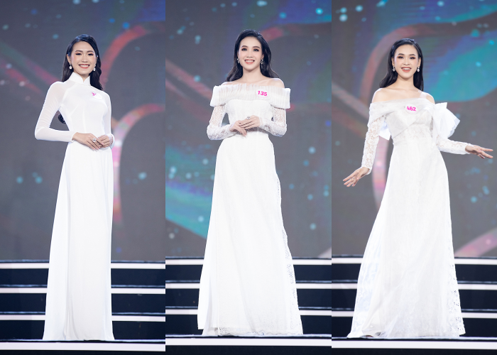 Diện áo dài trắng của nhà thiết kế Phạm Sĩ Toàn - Huỳnh Bảo Toàn và La Sen Vũ, 59 cô gái khoe nhan sắc tươi tắn, rạng ngời. Được tập luyện catwalk khá kỹ trước đêm bán kết nên dàn người đẹp tỏ ra tự tin sải bước trên sân khấu.