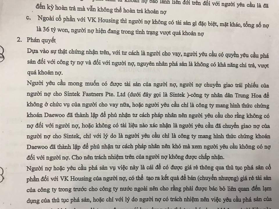 Với hai quyết định này, toà án trung tâm quận Seoul đã phán quyết công ty Sintek Fastners Pte. Ltd được chuyển giao khoản nợ của Công ty Daewoo Securities Co., Ltd. Phán quyết cũng giải thích rõ Sintek Fastners Pte. Ltd là công ty của Trung Quốc.