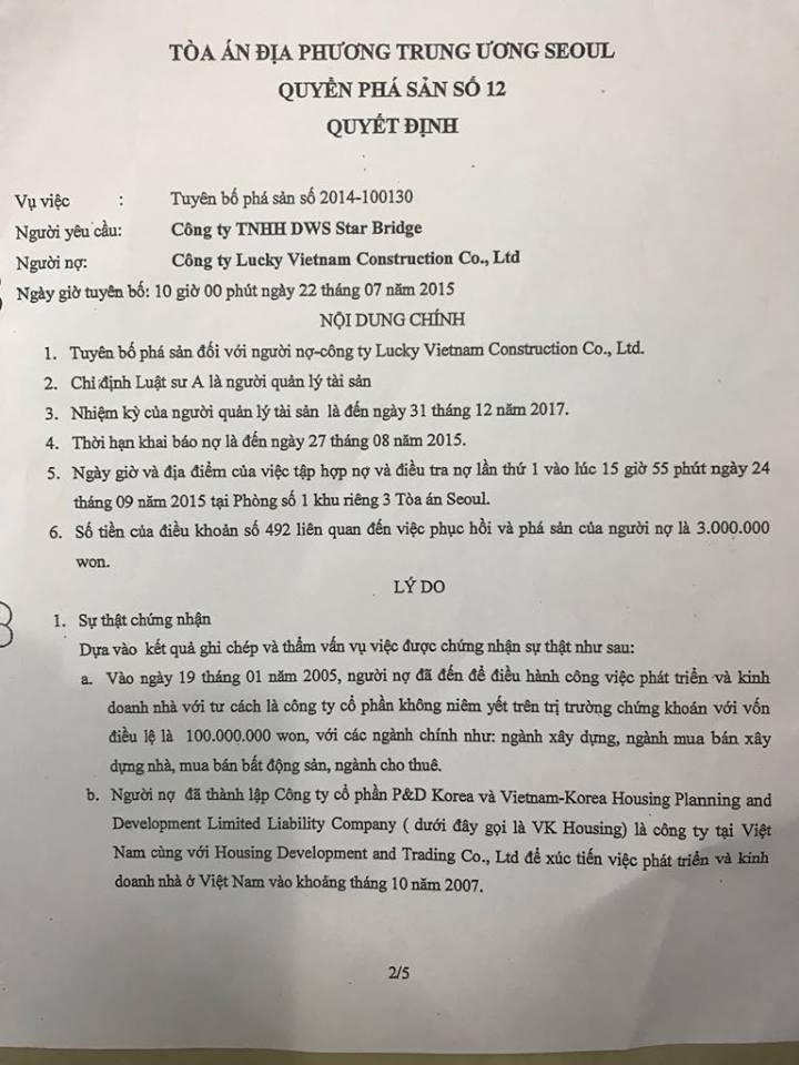 Ngày 22/07/2015, Toà án Quận trung tâm Seoul ban hành Quyết định tuyên bố phá sản số 2014Hahap100130 (phá sản đối với P&D) và số 2014HaHap10029 (phá sản đối với Công ty LCV). Quyết định tuyên bố phá sản của cả hai doanh nghiệp này đều xuất phát từ yêu cầu của Công ty DWS Star Bridge Limited Liability.