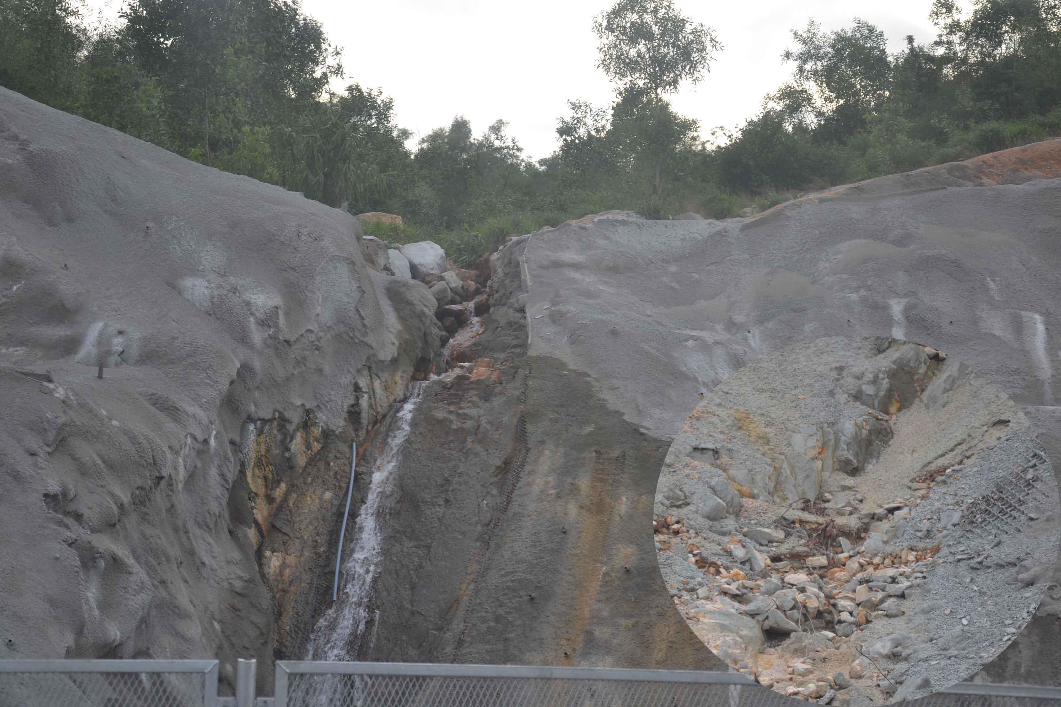 Ngoài ra do địa chất khu vực này chủ yếu cát kết, liên kết kém, đá bị phong hoá mạnh và có nhiều vết nứt nhỏ, làm tăng khả năng nứt to và phá vỡ liên kết khi gặp nước dẫn đến sụt trượt. “VEC đã xin Bộ GTVT chủ trương thay đổi biện pháp xử lý từ dạng khung sang dạng phun BT kết hợp neo và lưới thép, đã được Bộ chấp thuận và nhà thầu đã thực hiện xong bên phải”, EPMU Da Nang - Quang Ngai nêu.
