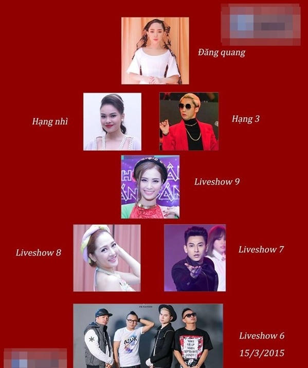 Theo bức ảnh được dân mạng chia sẻ, trong liveshow 6 diễn ra vào ngày 15.3 tới đây, các chàng trai nhóm PB Nation sẽ bị loại. Kế đó là đội của Isaac, Bảo Anh, Đông Nhi. Top 3 còn lại gồm Sơn Tùng, Giang Hồng Ngọc và người đăng quang là Tóc Tiên.