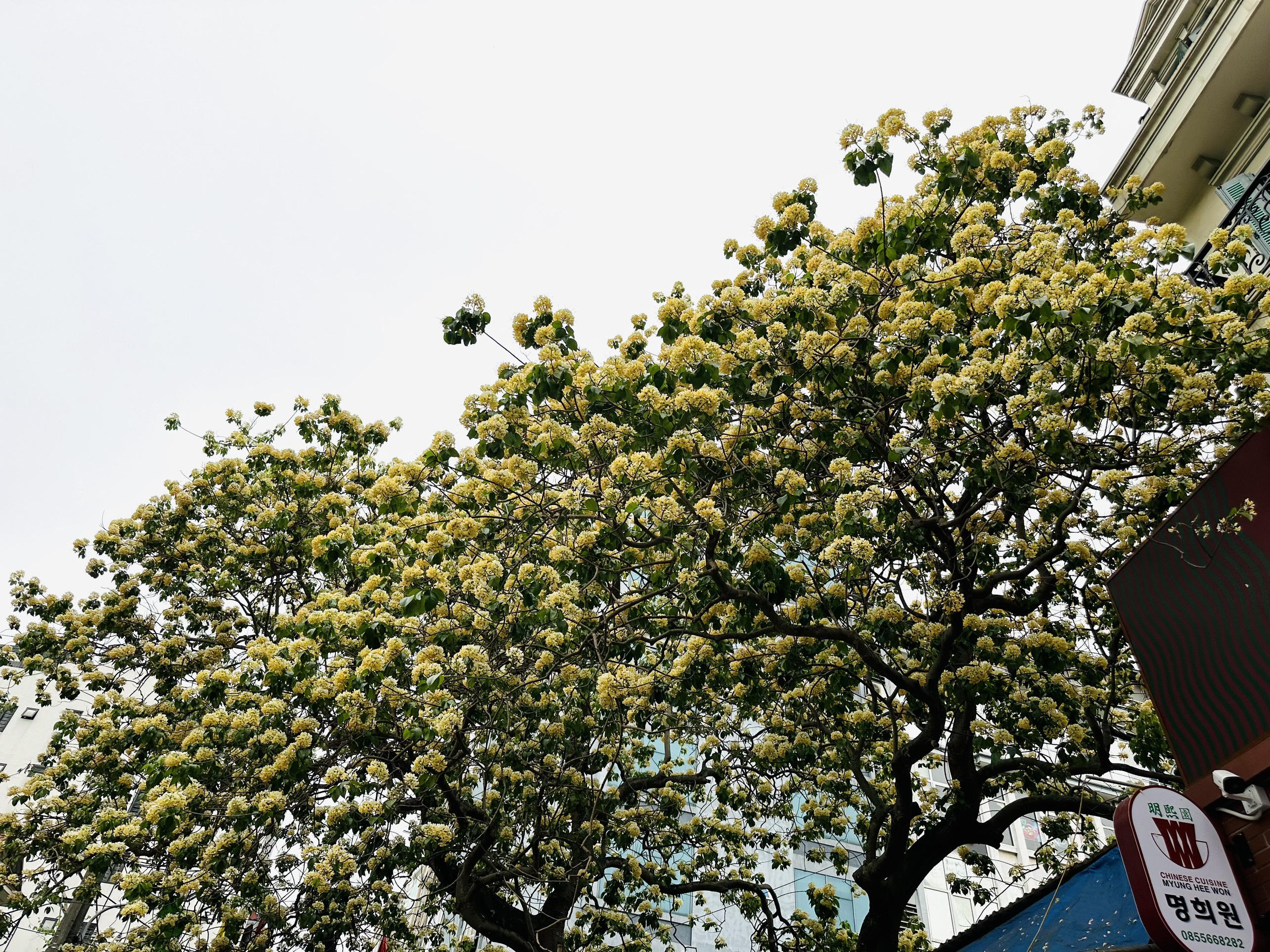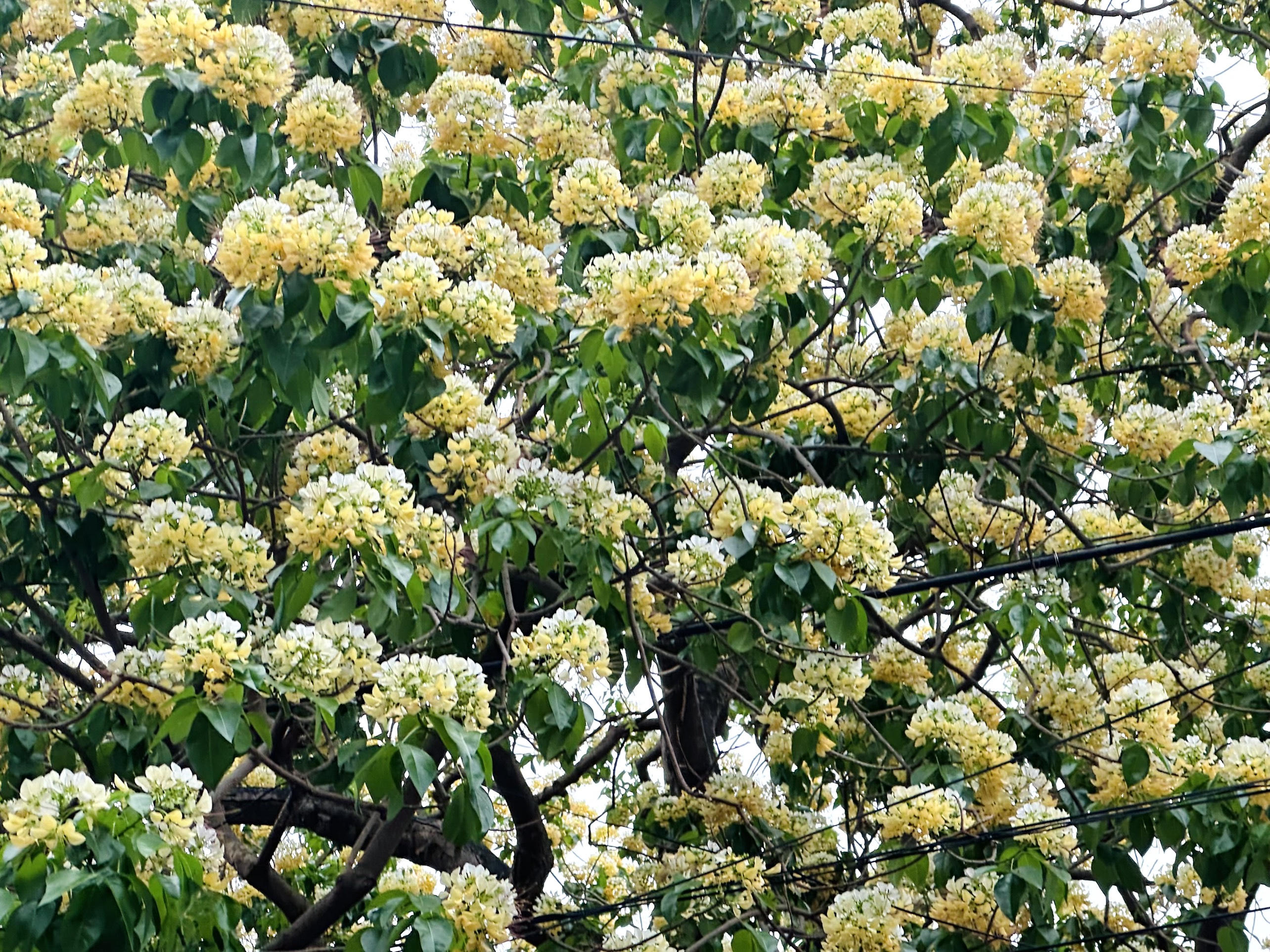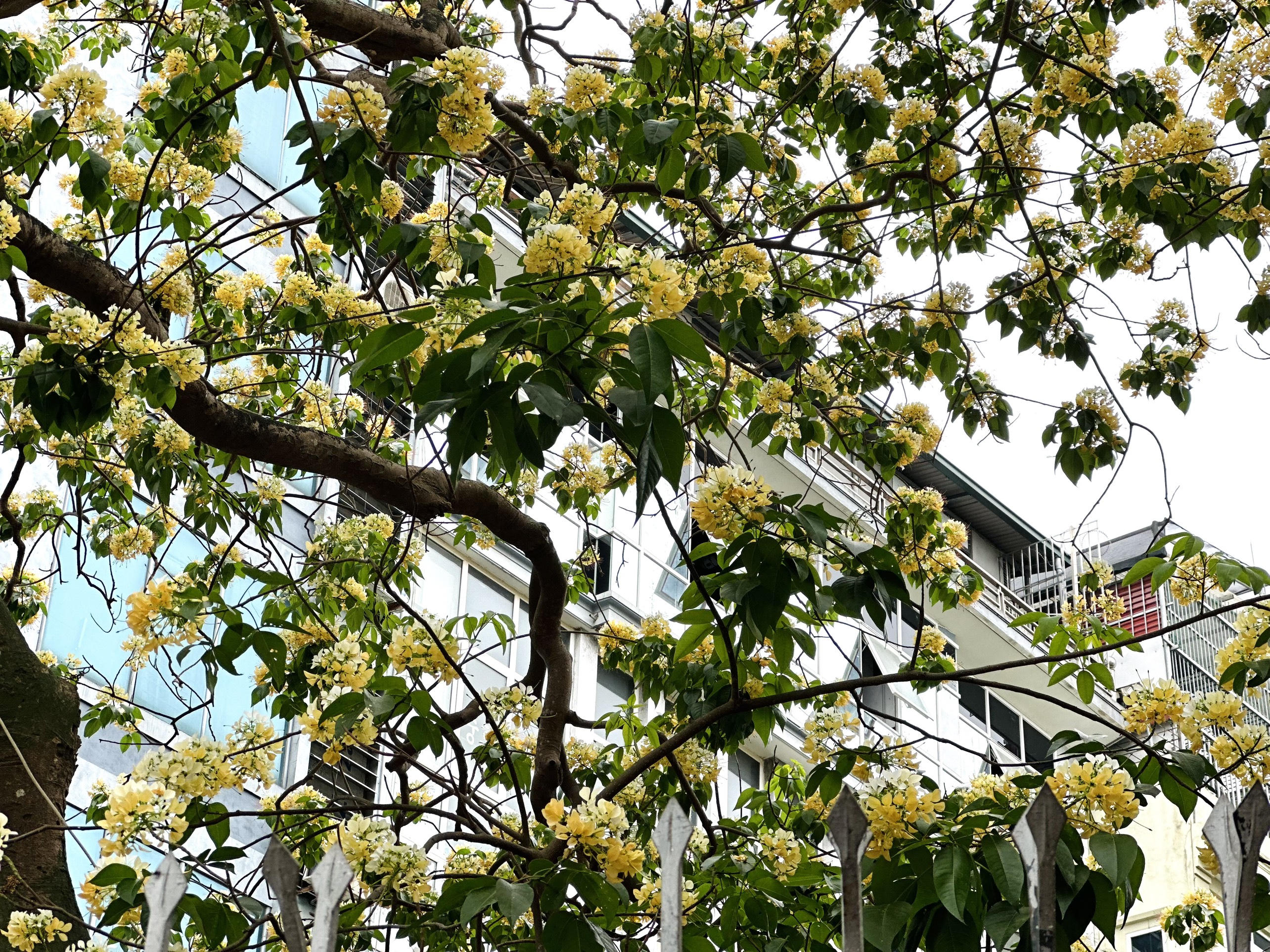 Những ngày đầu tháng 4, cây bún bung hoa rực rỡ, những chùm hoa đều tăm tắp nhuộm vàng cả một góc phố. Hoa có 2 màu vàng xen lẫn trắng, nhụy hoa trông như sợi bún, mỗi chùm hoa giống như một con bún.