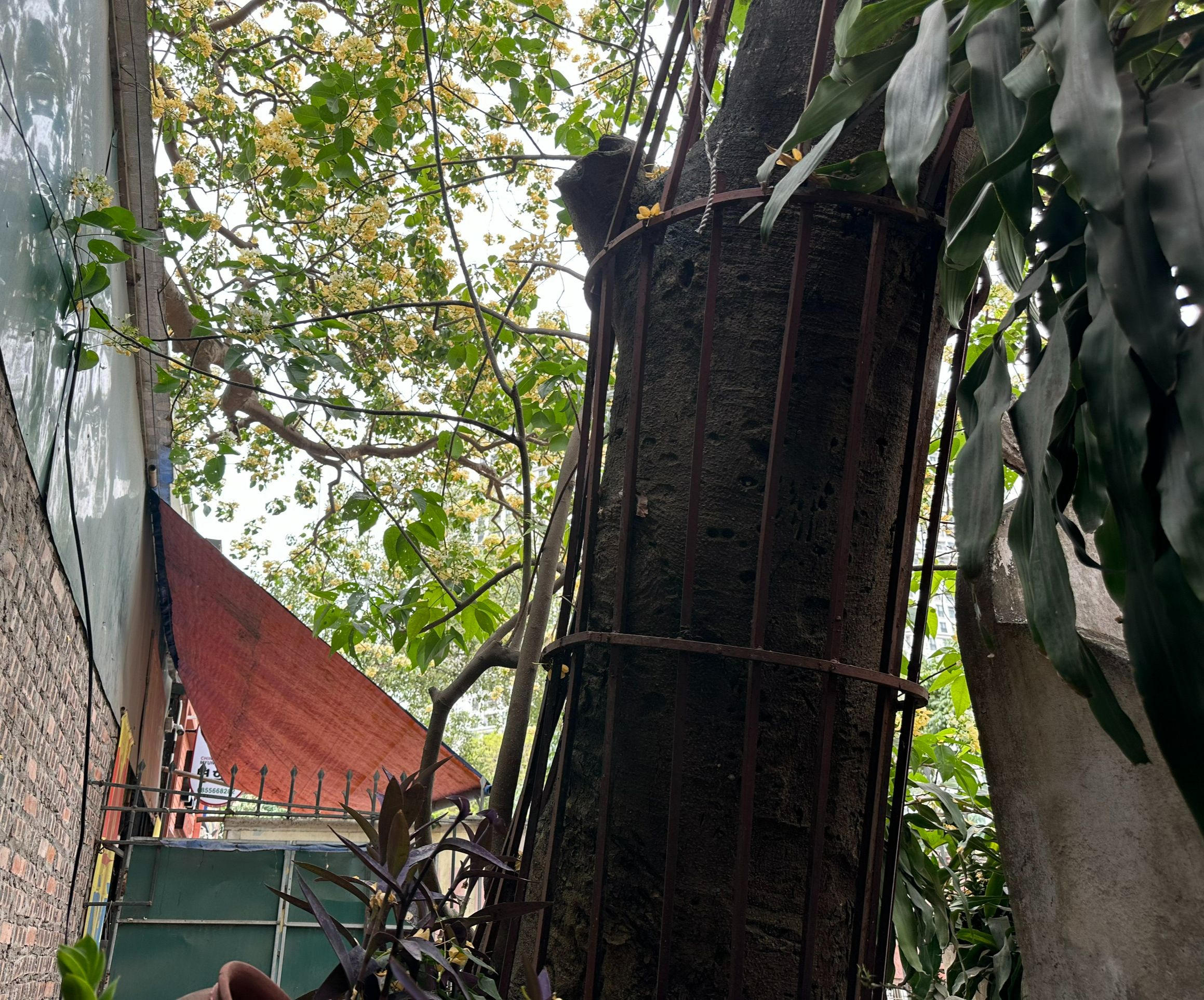 Khu vực gốc cây được rào lại chắc chắn để bảo vệ cây.