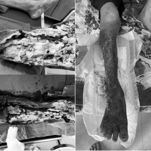 Bệnh nhân T. vào viện trong tình trạng sốc nhiễm trùng, hoại tử da và mô mềm cẳng bàn chân phải ngày càng tăng. Tổn thương có xu hướng lan lên vùng đùi, vùng thành bụng phải.