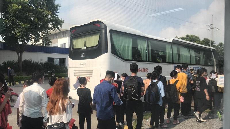 Công nhân Công ty TNHH Dreamtech Việt Nam lên xe vào khu cách ly tập trung. |