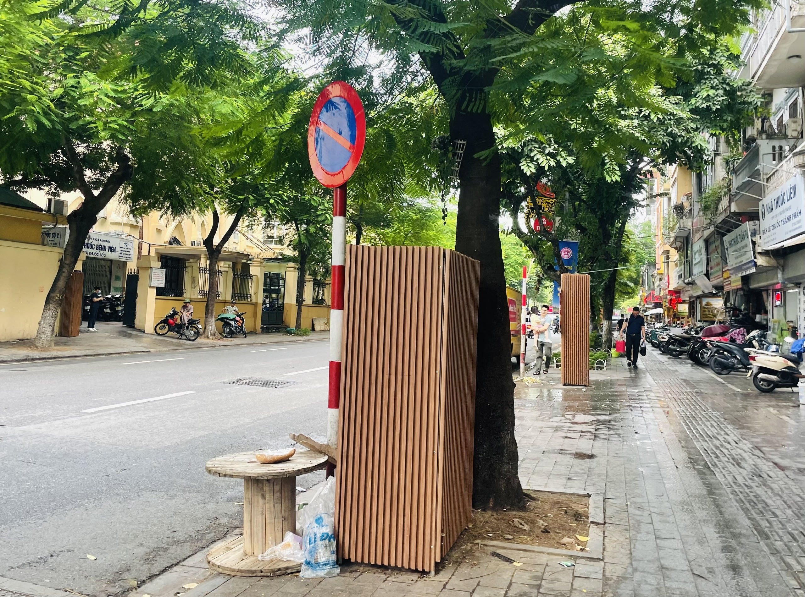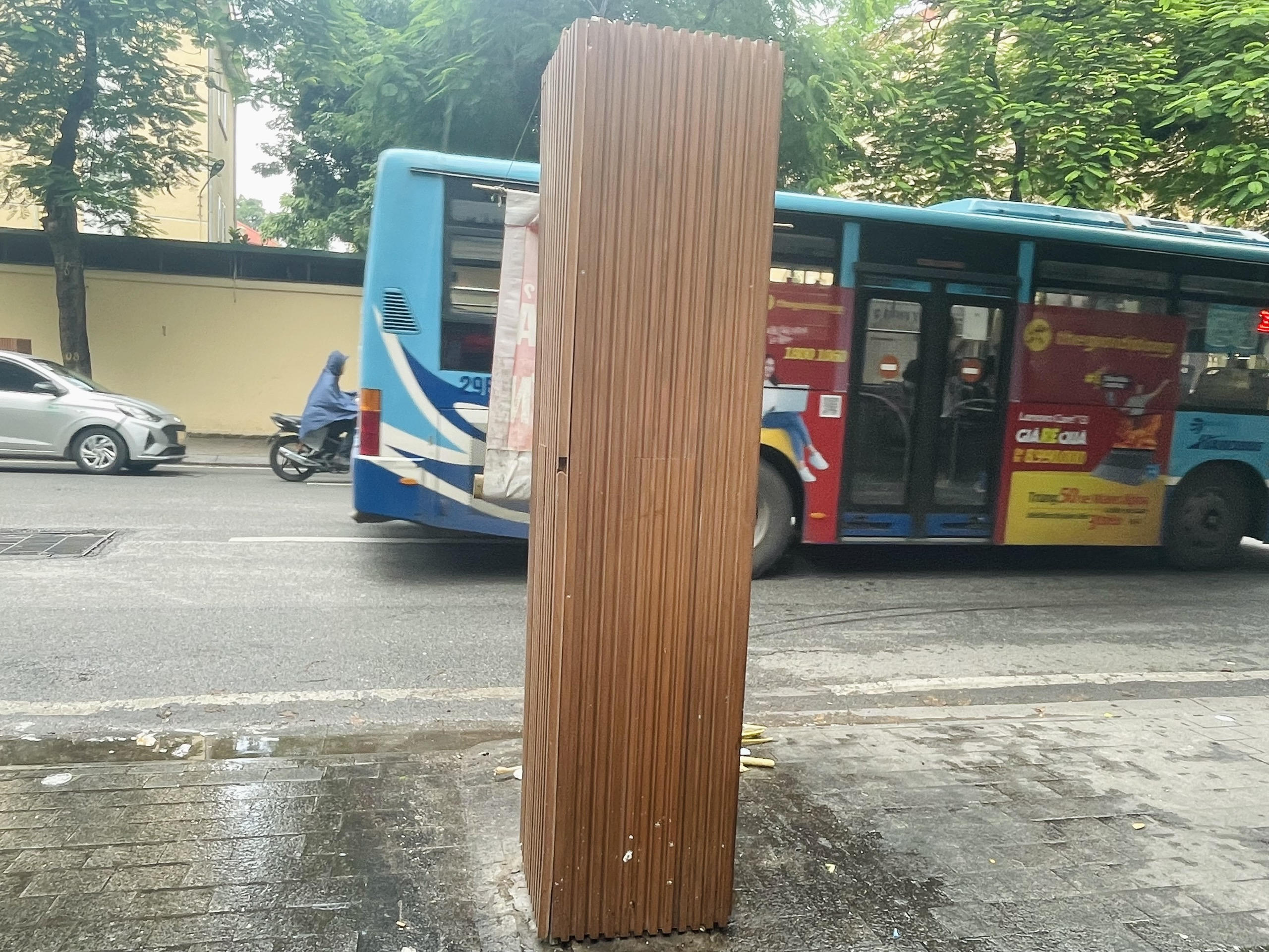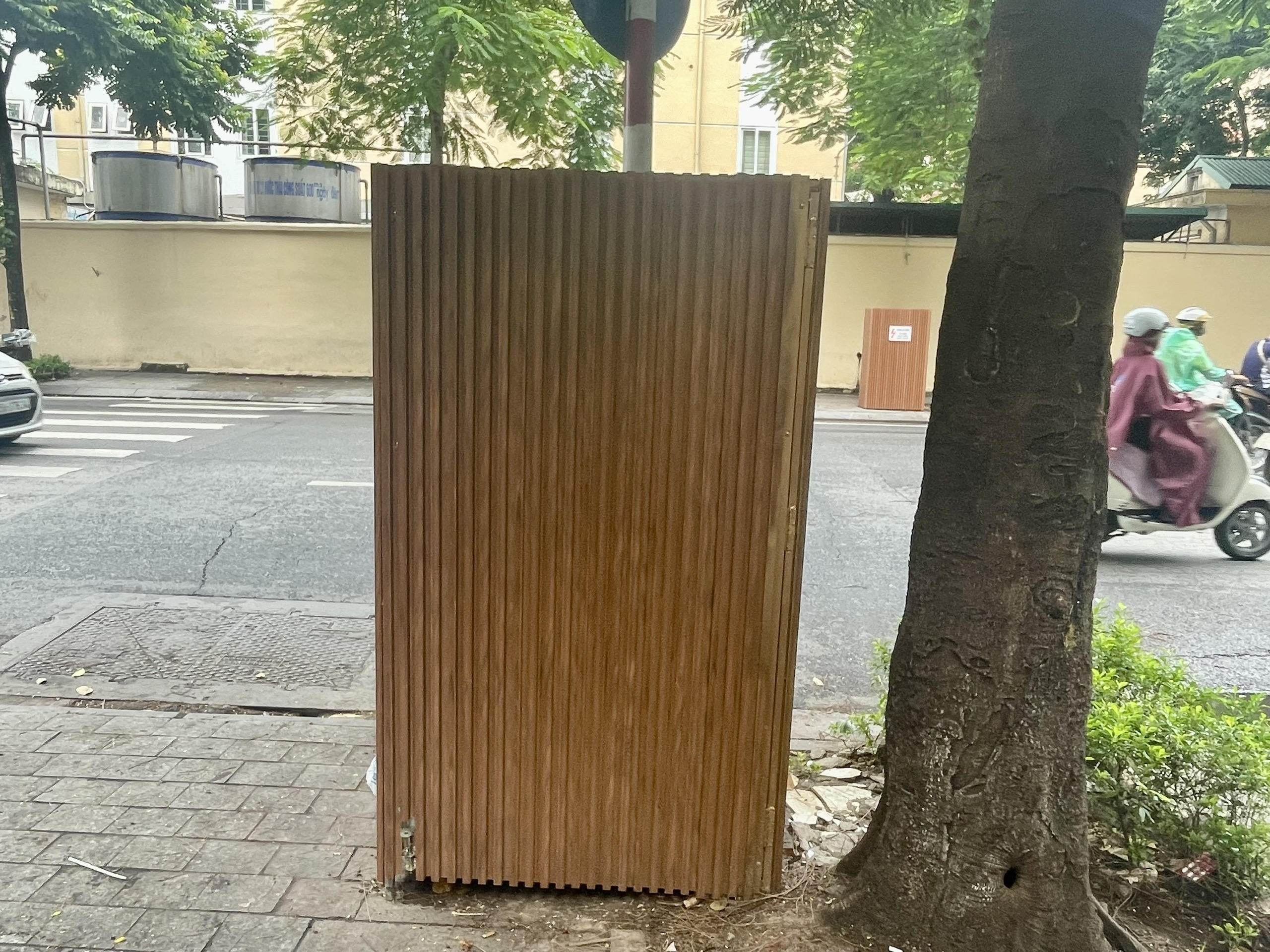 Loạt bốt điện trên tuyến đường Nguyễn Thái Học (quận Ba Đình) được thay 'áo mới', bọc ngoài bằng khung kim loại màu nâu, làm từ vật liệu ốp nhựa giả gỗ.