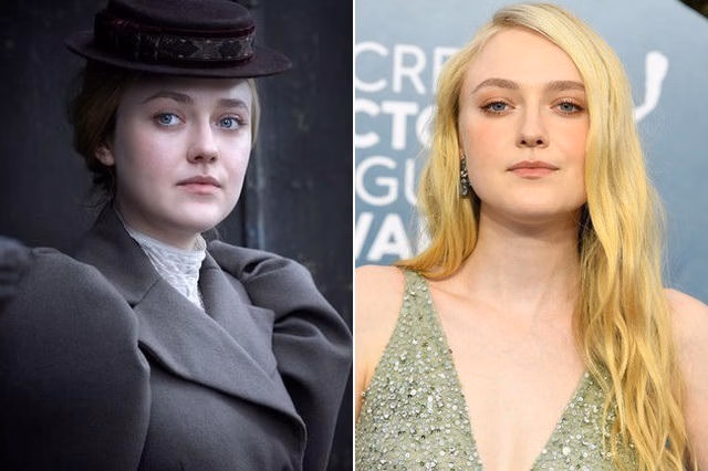 Dakota Fanning khi thủ vai Sara Howard, cảnh sát đầu tiên của New York (ảnh trái) trong phim The Alienist trông già dặn và chín chắn hơn cô ngoài đời thường (ảnh phải)