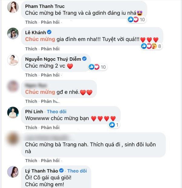 Bên dưới bài viết, nhiều cư dân mạng gửi lời chúc mừng đến gia đình Vân Trang. Không thể thiếu trong số đó chính là những người bạn, đồng nghiệp của cô trong giới diễn viên như Thúy Diễm, Lê Khánh, Thanh Trúc, Lý Thanh Thảo, Huỳnh Đông, Huỳnh Quý, Hà Trí Quang…