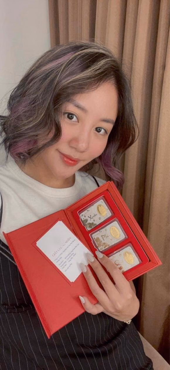 "Trộm vía, dịp này ai cũng nên mua chút vàng cầu may nhé mọi người! Hương sợ đông vào ngày đó nên tranh thủ mua trước. Qua ngày mùng 6 đến mùng 10 thì đều hợp ngày để mua vàng Thần tài. Năm mới chúc tất cả mọi người cùng phát tài nhé, nhớ phải mua chút vàng đầu năm nha!", Văn Mai Hương chia sẻ.
