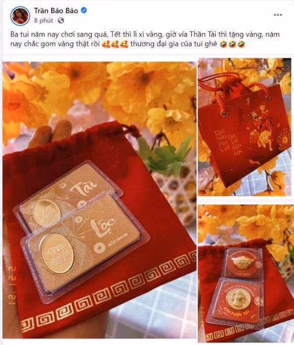 BB Trần khoe được ba tặng vàng trong ngày vía Thần tài năm nay: "Ba tôi năm nay chơi sang quá! Tết thì lì xì vàng, giờ vía Thần tài thì tặng vàng, năm nay chắc gom vàng thật rồi! Thương đại gia của tôi ghê!".