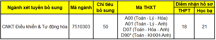 Ngành đào tạo, chỉ tiêu, tổ hợp môn xét tuyển bổ sung và điểm nhận hồ sơ: